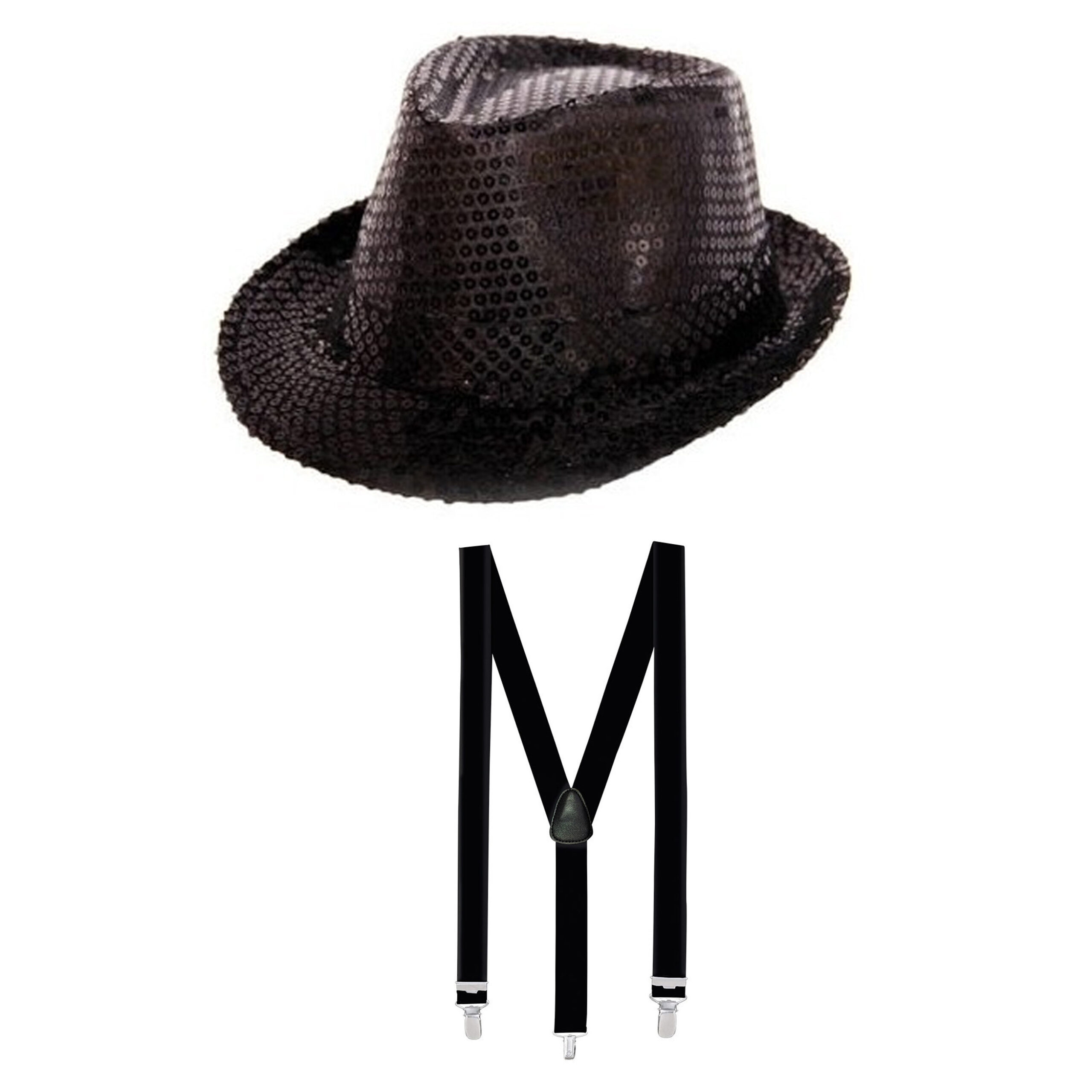Carnaval verkleed zwart kleuren setje met glitter hoed en bretels. Het hoedje heeft pailletten. Voor volwassenen, dames en heren. Lekker opvallen met deze uni-kleur thema verkleedset. Verkleedkleding kostuums outfit accessoires zwart. Themas: Disco, Eighsuspenderss, Foute party, Toppers, Carnaval, Black and White. Let op: dit is een verkleedaccessoire voor volwassenen, geen speelgoed. , Dit artikel bestaat uit:, 1x Trilby hoed met pailletten – zwart – polyester – glitter, 1x Carnaval/verkleed bretels – tot 120 cm – zwart – Carnaval kleding accessoires