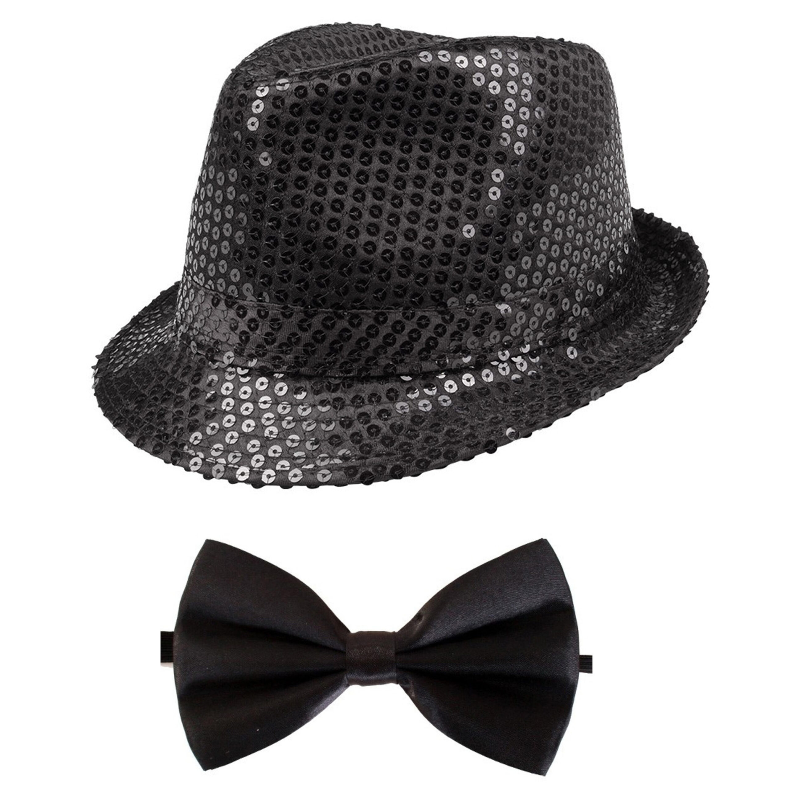 Carnaval verkleed zwart kleuren setje met glitter hoed en vlinderstrikje. Het hoedje heeft pailletten. Voor volwassenen, dames en heren. Lekker opvallen met deze uni-kleur thema verkleedset. Verkleedkleding kostuums outfit accessoires zwart. Themas: Disco, Eighties, Foute party, Toppers, Carnaval. Let op: dit is een verkleedaccessoire voor volwassenen, geen speelgoed. , Dit artikel bestaat uit:, 1x Carnaval verkleed trilby hoedje met pailletten – Zwart – volwassenen – Glitter and Glamour, 1x Carnaval verkleed vlinderstrikje – zwart – 12 cm – voor dames/heren – strikken – kleding