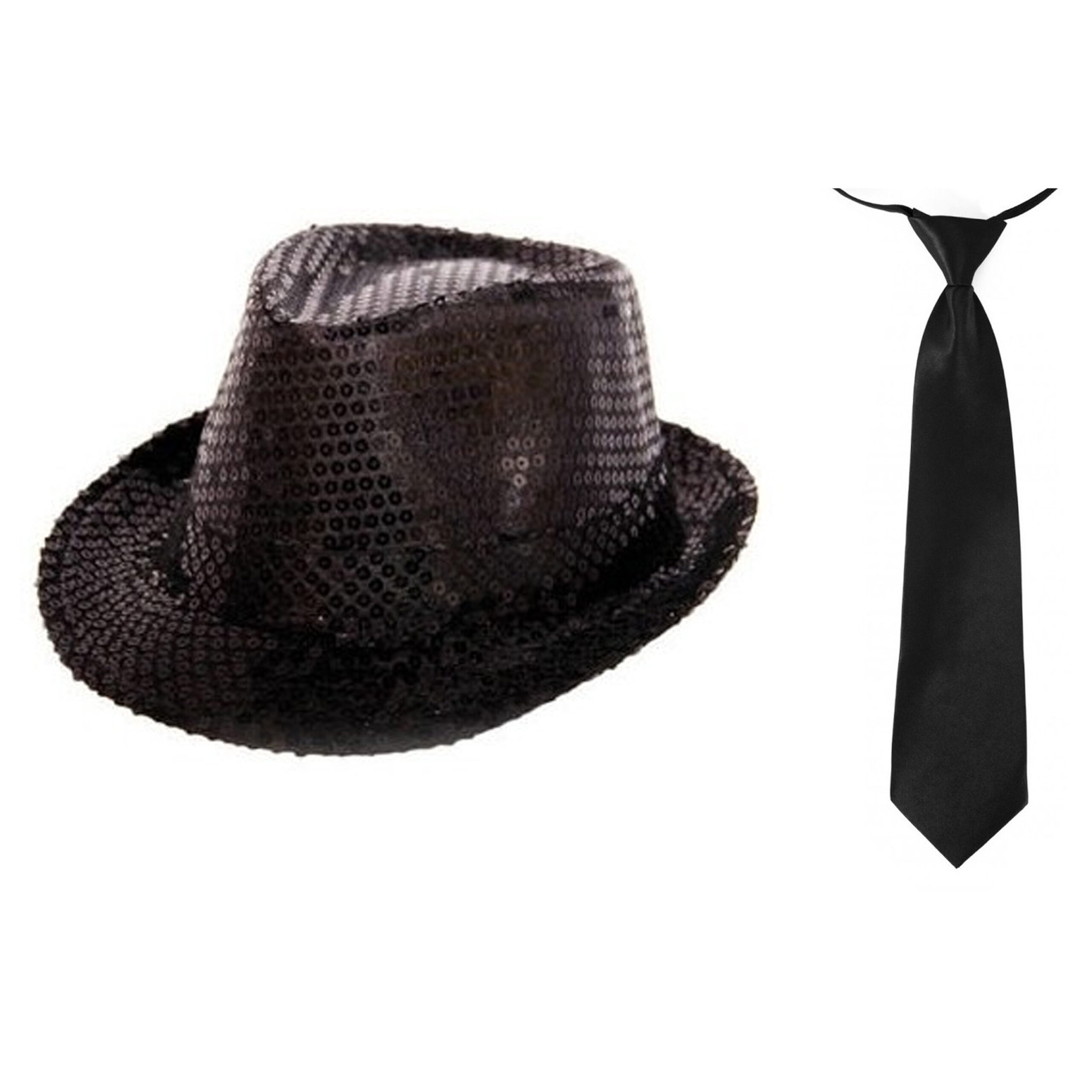 Carnaval verkleed zwart kleuren setje met glitter hoed en stropdas. Het hoedje heeft pailletten. Voor volwassenen, dames en heren. Lekker opvallen met deze uni-kleur thema verkleedset. Verkleedkleding kostuums outfit accessoires zwart. Themas: Disco, Eighties, Foute party, Toppers, Carnaval, Black and White. Let op: dit is een verkleedaccessoire voor volwassenen, geen speelgoed. , Dit artikel bestaat uit:, 1x Carnaval verkleed stropdas – zwart – volwassenen – 40 cm – met elastiekje, 1x Zwarte trilby glitter party hoedje met pailletten