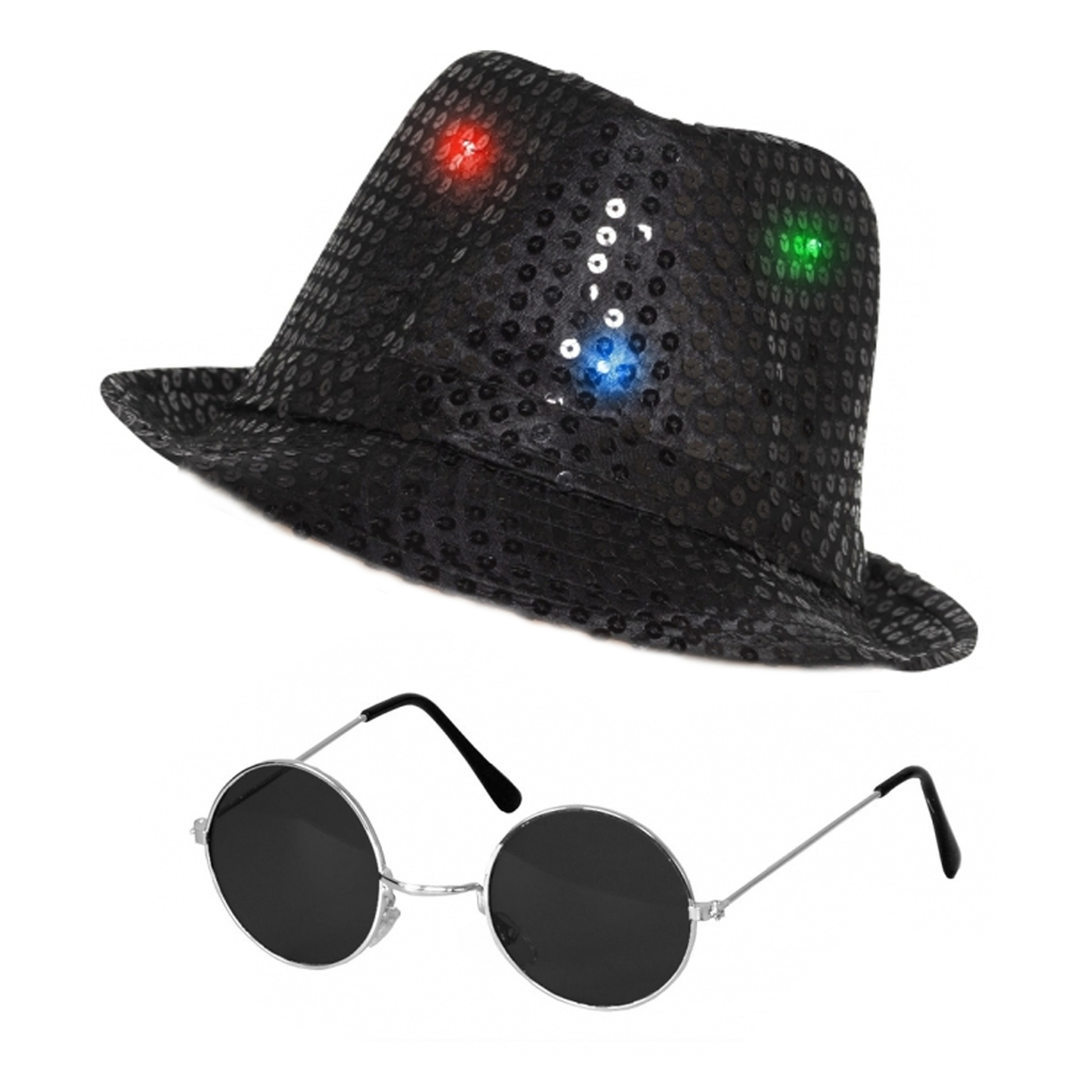 Carnaval verkleed zwart kleuren setje met glitter LED lampjes hoedje en een party ronde glazen Hippie bril. Het hoedje heeft pailletten. Voor volwassenen, dames en heren. Lekker opvallen met deze uni-kleur thema verkleedset. Verkleedkleding kostuums outfit accessoires zwart. Themas: Disco, Eighparty glassess, Foute party, Toppers, Carnaval, Black and White. Hoed LED lichtjes heeft verschillende standen. Inclusief batterijen (niet vervangbaar). Let op: dit is een verkleedaccessoire voor volwassenen, geen speelgoed. , Dit artikel bestaat uit:, 1x Steampunk verkleed bril – zwart – ronde glazen – feestbril – zonnebril, 1x Zwart pailletten hoedje met LED licht