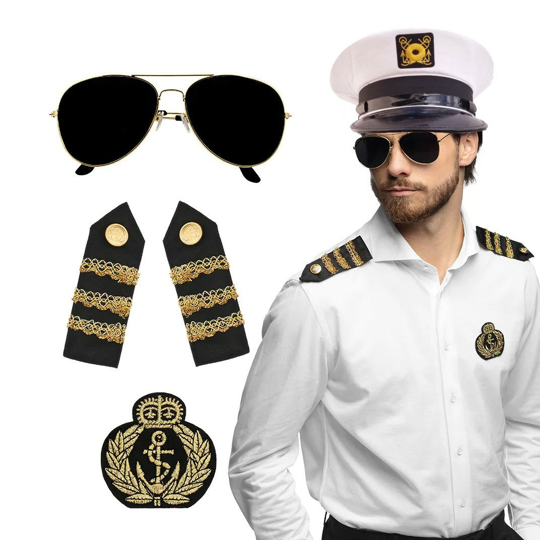 Carnaval verkleed set, bestaande uit een luxe kapiteinspet in de kleur wit, een zonnebril met donkere glazen, schouder epauletten en een zeeman badge. Geschikt voor heren en dames. Verkleedkleding kostuums accessoires. Thema: Kapitein, Maritiem, Zeevaart, Marine.