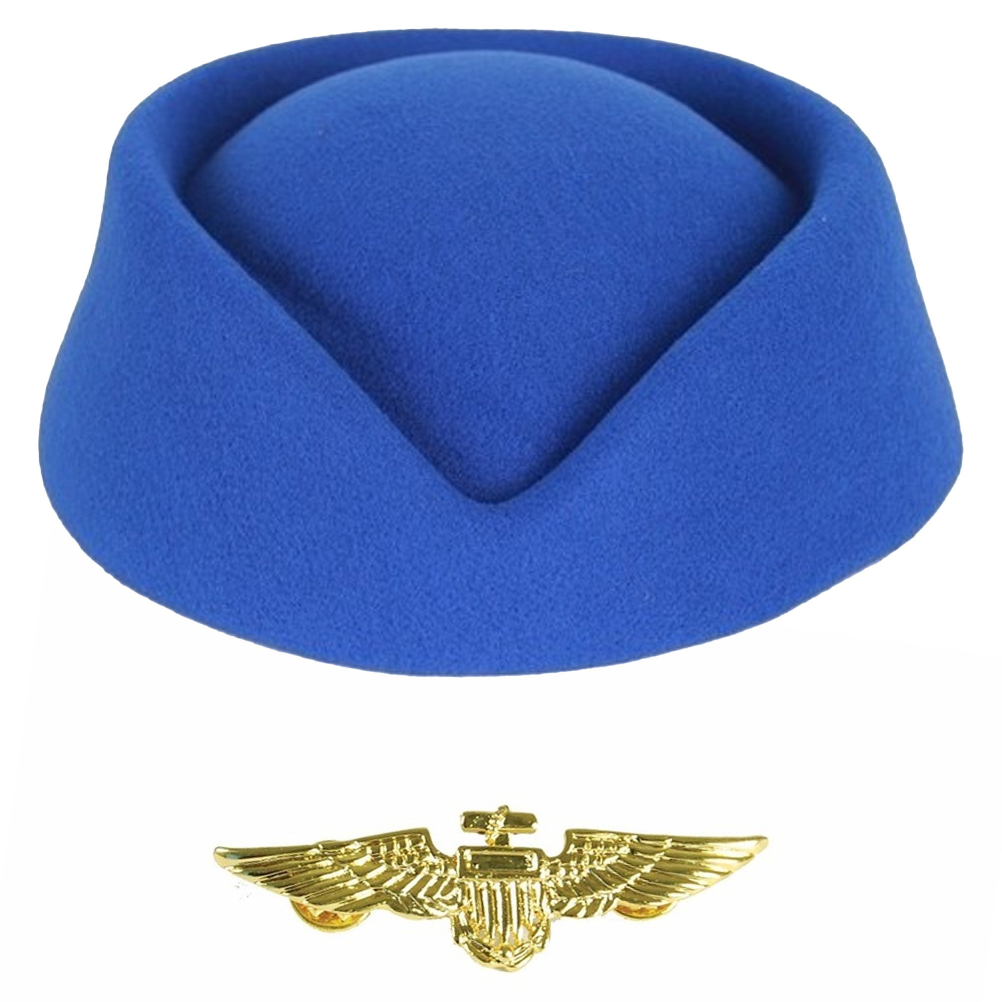 Carnaval verkleed setje, bestaande uit een stewardessen hoedje in de kleur blauw en een Wings broche in het goud. Geschikt voor dames. Verkleedkleding kostuums accessoires. Thema: Stewardessen, luchtvaart, vliegeniers, luchtmacht, leger.