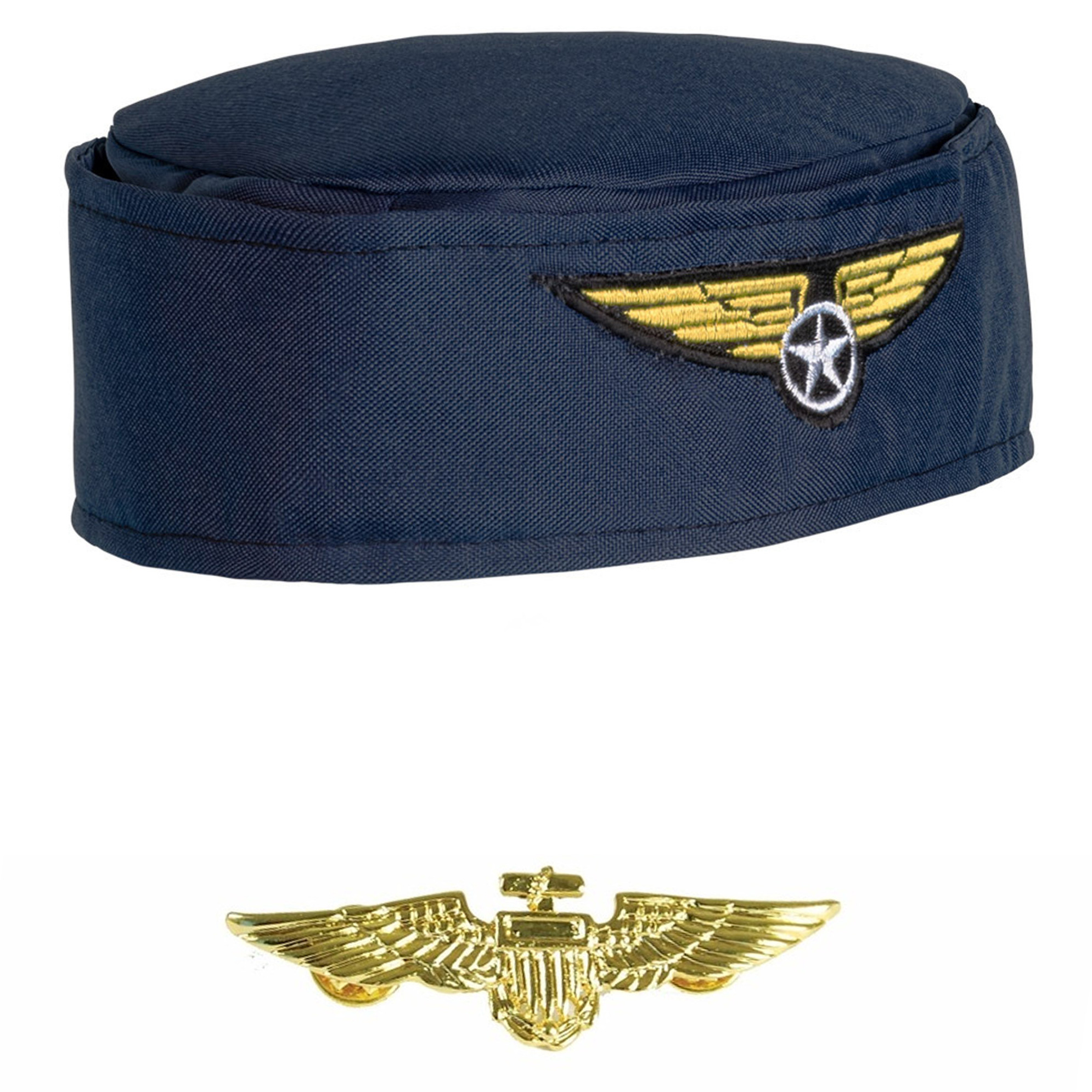 Carnaval verkleed setje, bestaande uit een stewardessen hoedje in de kleur blauw en een Wings broche in het goud. Geschikt voor dames. Verkleedkleding kostuums accessoires. Thema: Stewardessen, luchtvaart, vliegeniers, luchtmacht, leger.