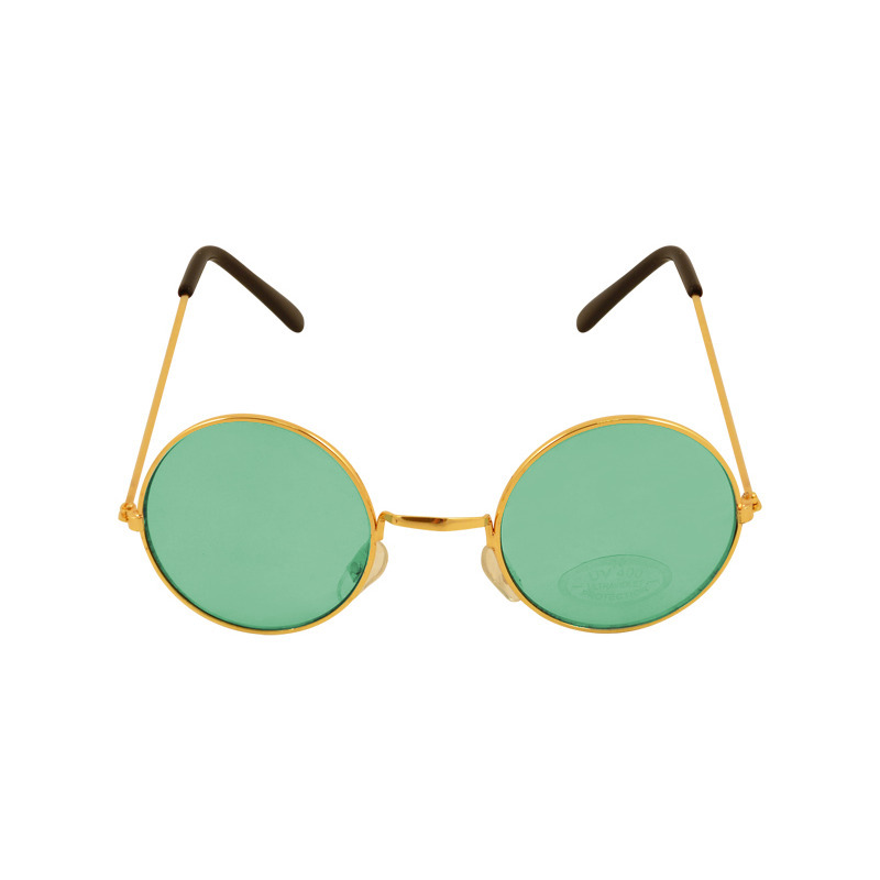 Carnaval hippie flower power sixties verkleed zonnebril in het groen met een gouden frame en ronde glazen. Ideaal om uw verkleedset of oufit compleet te maken met deze hippie party bril. Materiaal: metaal/glas. Voor volwassenen. Let op: dit is een verkleedaccessoire voor volwassenen, geen speelgoed.