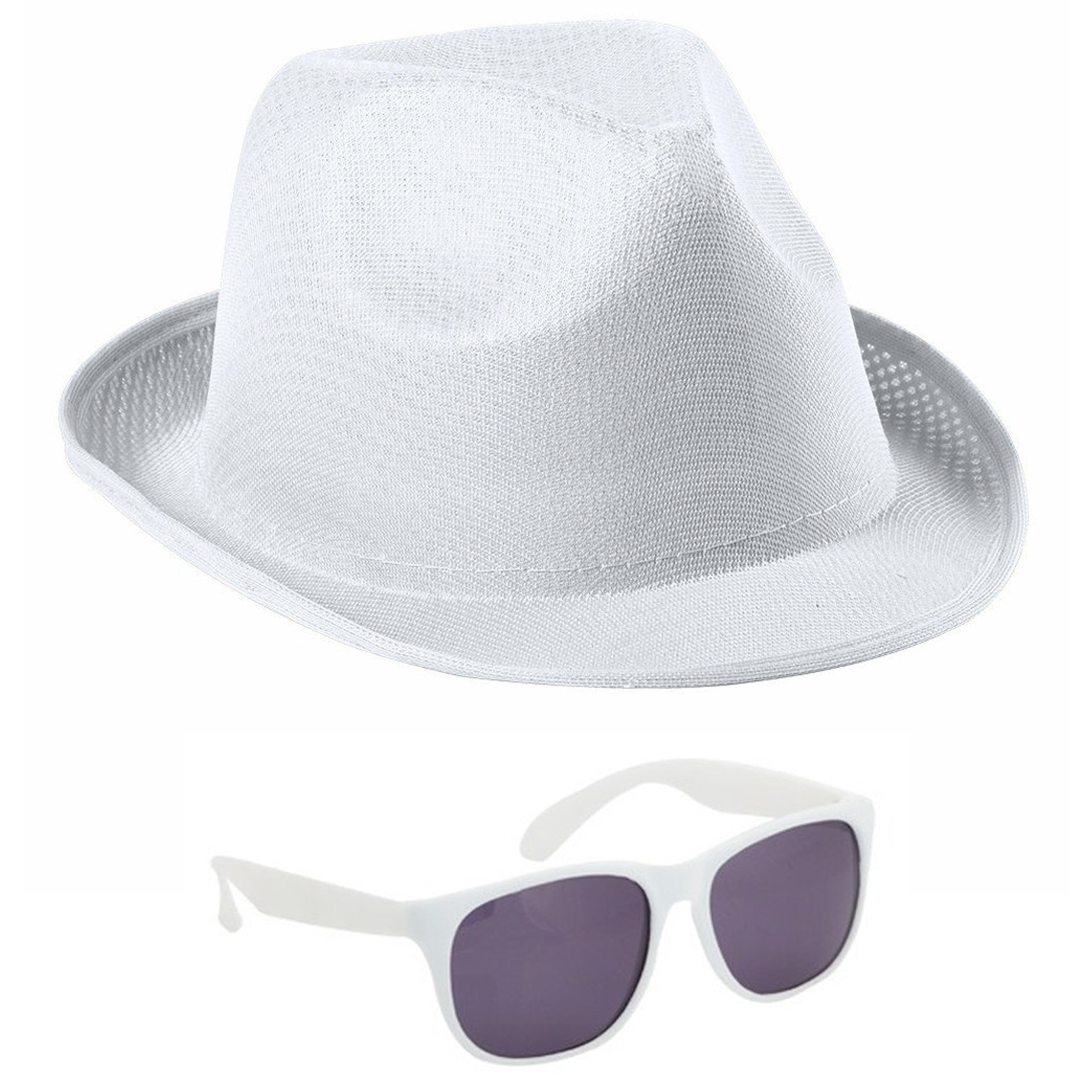 Carnaval verkleed setje bestaande uit een hoedje en een party zonnebril in de kleur wit. Voor volwassenen, dames en heren. Lekker opvallen met deze thema verkleedset. Verkleedkleding kostuums accessoires. Themas: Disco, Eighties, Toppers, Festival. De kleuren kunnen soms iets afwijken van elkaar. Let op: dit is een verkleedaccessoire voor volwassenen, geen speelgoed. , Dit artikel bestaat uit:, 1x Party zonnebril – wit – kunststof – UV400 – verkleedbril voor volwassenen, 1x Carnaval verkleed trilby hoedje – wit – polyester – volwassenen/heren/dames