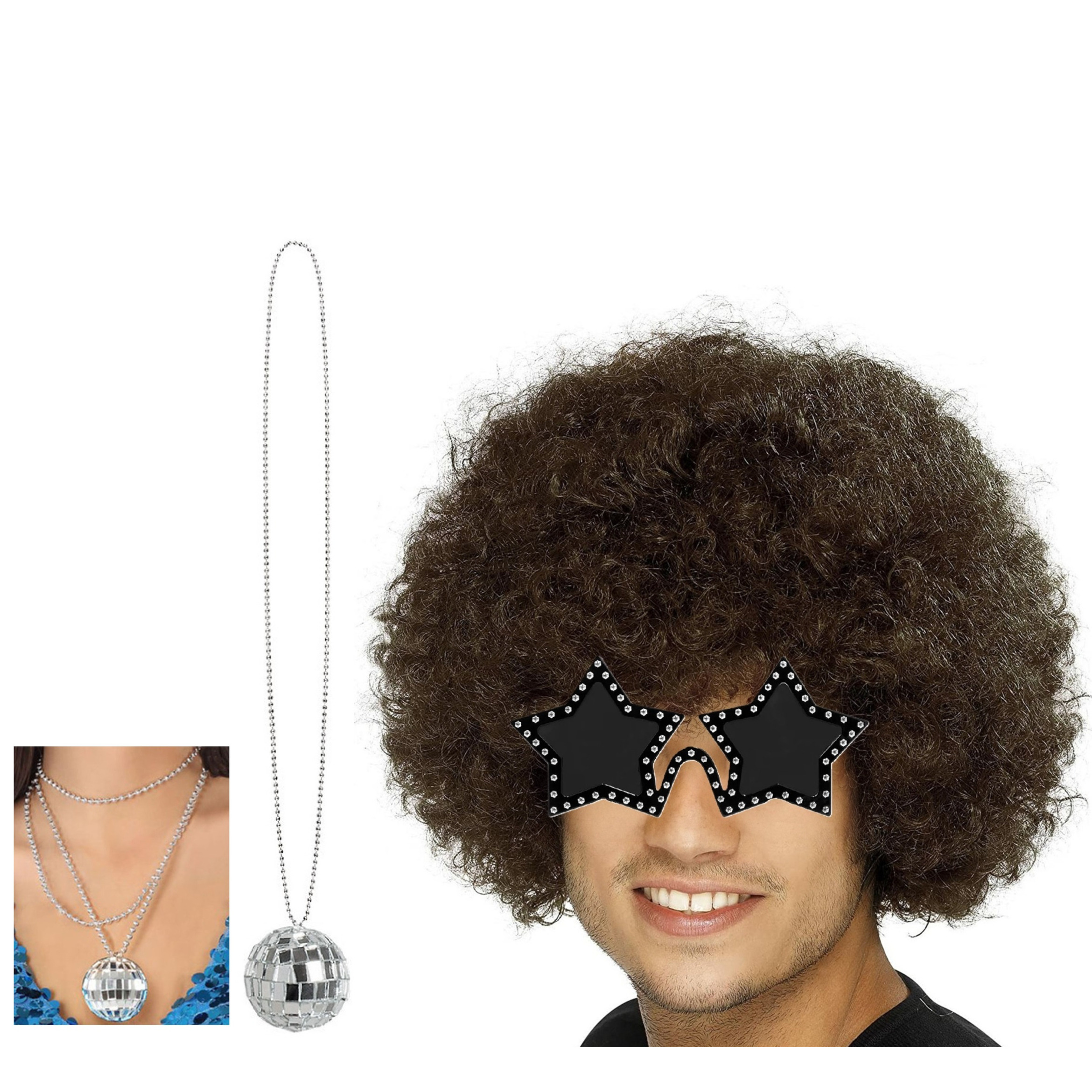 Smiffys grote Afropruik of carnaval verkleed pruik in de kleur bruin met grote bos krullen, samen met een sterren zonnebril en een disco bal ketting geschikt voor heren en dames. Ga verkleed in een Seventies/disco/eighties thema. Uw verkleedkleding kostuum heeft altijd accessoires nodig om completer te worden. Beleef het verleden en transformeer je naar die tijd. Let op: dit is een verkleedaccessoire voor volwassenen, geen speelgoed. , Dit artikel bestaat uit:, 1x Smiffys Mega afro pruik – bruin – krullen – dames en heren – Seventies, 1x Verkleed sieraden ketting disco spiegelbal – zilver – dames – kunststof – Seventies/Eighties thema, 1x Carnaval/verkleed party bril Stars – Disco/eighties thema – zwart – volwassenen