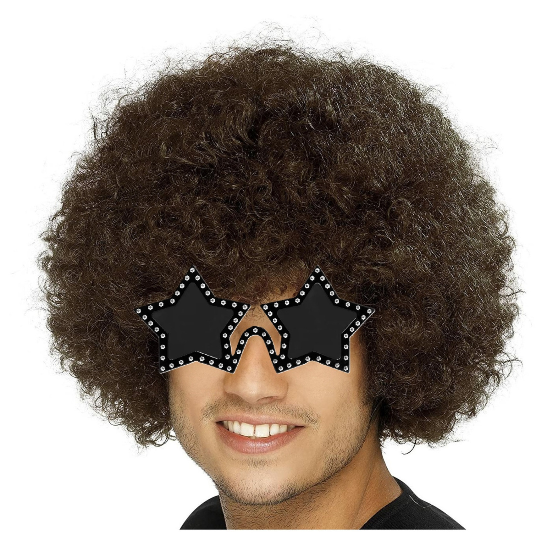 Smiffys grote Afropruik of carnaval verkleed pruik in de kleur bruin met grote bos krullen, samen met een sterren zonnebril geschikt voor heren en dames. Ga verkleed in een Seventies/disco/eighties thema. Uw verkleedkleding kostuum heeft altijd accessoires nodig om completer te worden. Beleef het verleden en transformeer je naar die tijd. , Dit artikel bestaat uit:, 1x Smiffys Mega afro pruik – bruin – krullen – dames en heren – Seventies, 1x Carnaval/verkleed party bril Stars – Disco/eighties thema – zwart – volwassenen