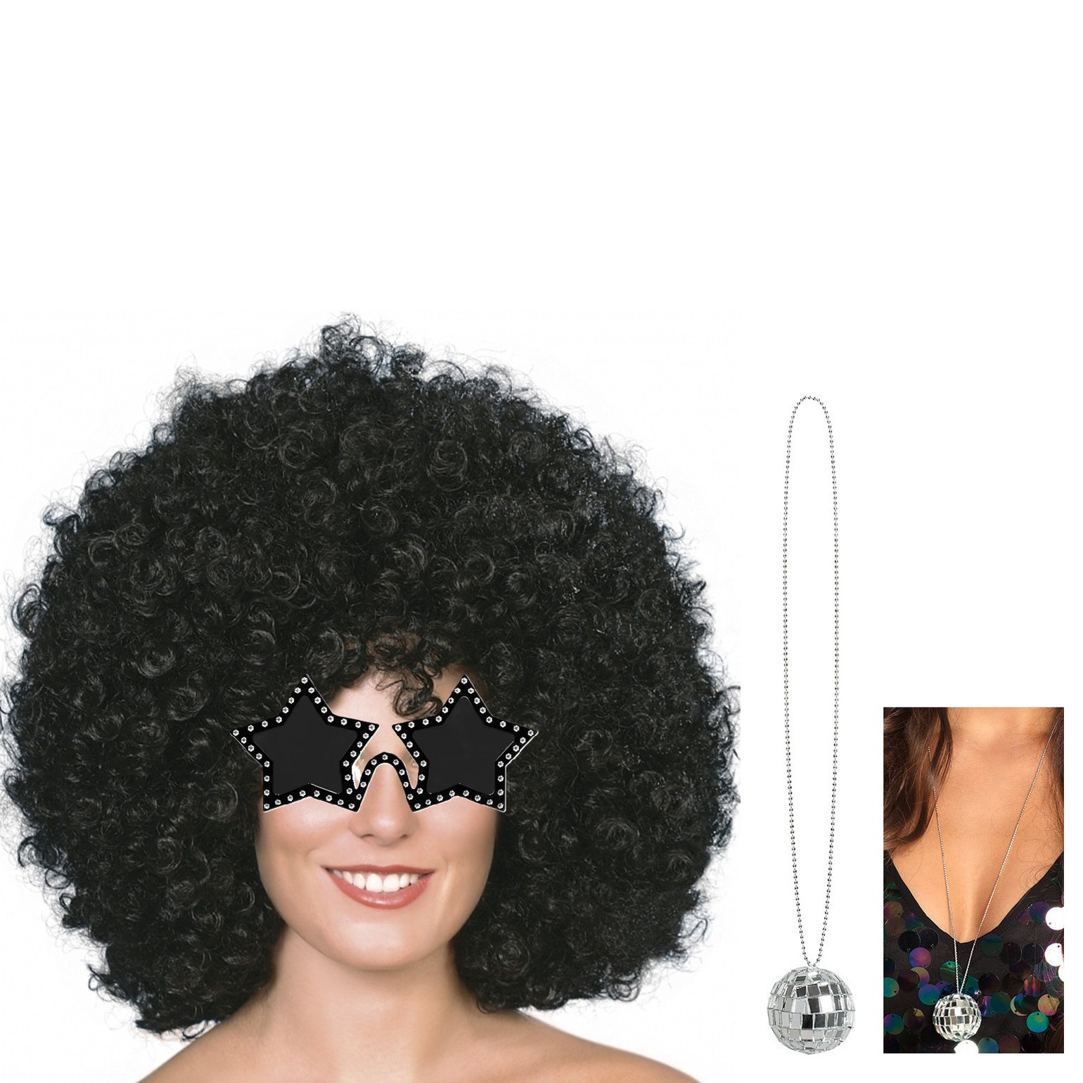 Smiffys grote Afropruik of carnaval verkleed pruik in de kleur zwart met grote bos krullen, samen met een sterren zonnebril en een disco bal ketting geschikt voor heren en dames. Ga verkleed in een Seventies/disco/eighties thema. Uw verkleedkleding kostuum heeft altijd accessoires nodig om completer te worden. Beleef het verleden en transformeer je naar die tijd. Lets party. , Dit artikel bestaat uit:, 1x Carnaval verkleed Mega afro pruik – zwart – krullen – dames en heren – Seventies, 1x Carnaval/verkleed party bril Stars – Disco/eighties thema – zwart – volwassenen, 1x Carnaval/verkleed accessoires Disco/eigties/seventies sieraden – ketting – zilver – kunststof
