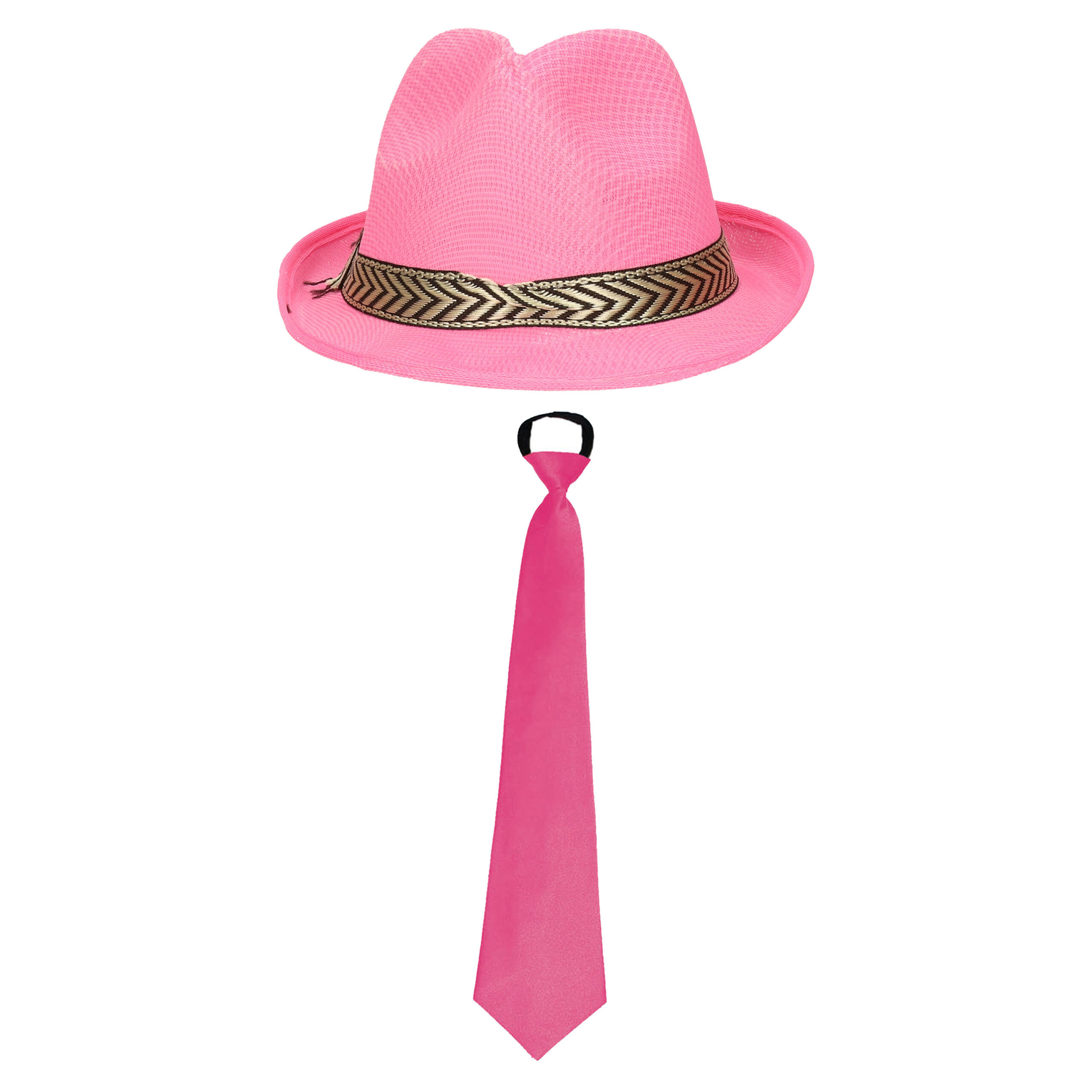 Carnaval compleet verkleed setje Pinkman, bestaande uit een coole trilby gleufhoed met band en een voorgeknoopte stropdas in de kleur roze. Voor volwassenen, dames en heren. Serieus opvallen met deze uni kleuren thema verkleedset in het roze. Verkleedkleding kostuums accessoires. Themas: Disco, Glitter and Glamour, VIP, en wat u zelf nog verzint. De kleuren kunnen soms iets van elkaar afwijken, maar zal altijd goed bij elkaar passen.