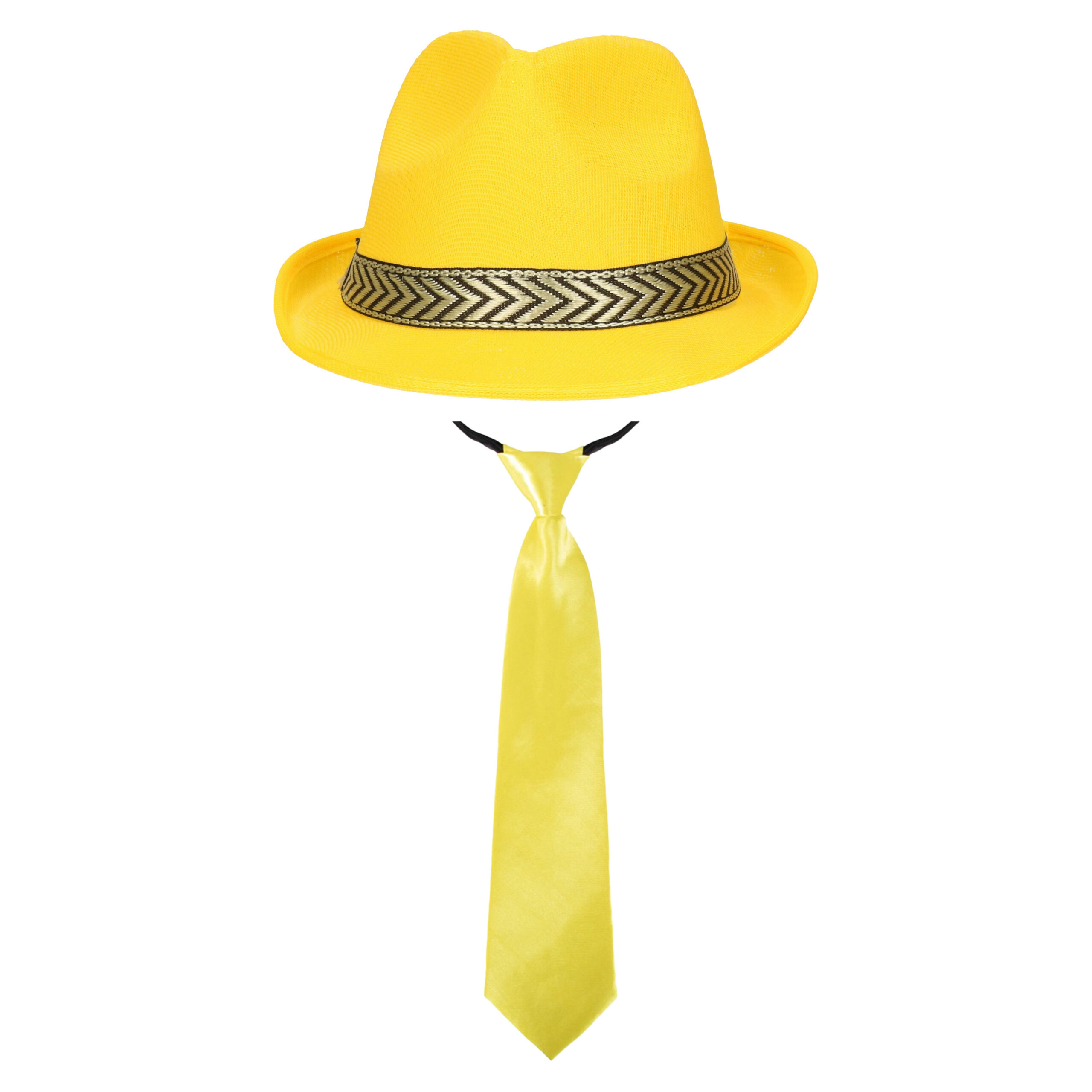 , Dit artikel bestaat uit:, 1x Carnaval verkleed stropdas – geel – volwassenen – 40 cm – met elastiekje, 1x Carnaval verkleed Trilby/gangster hoedje – geel – polyester – heren/dames