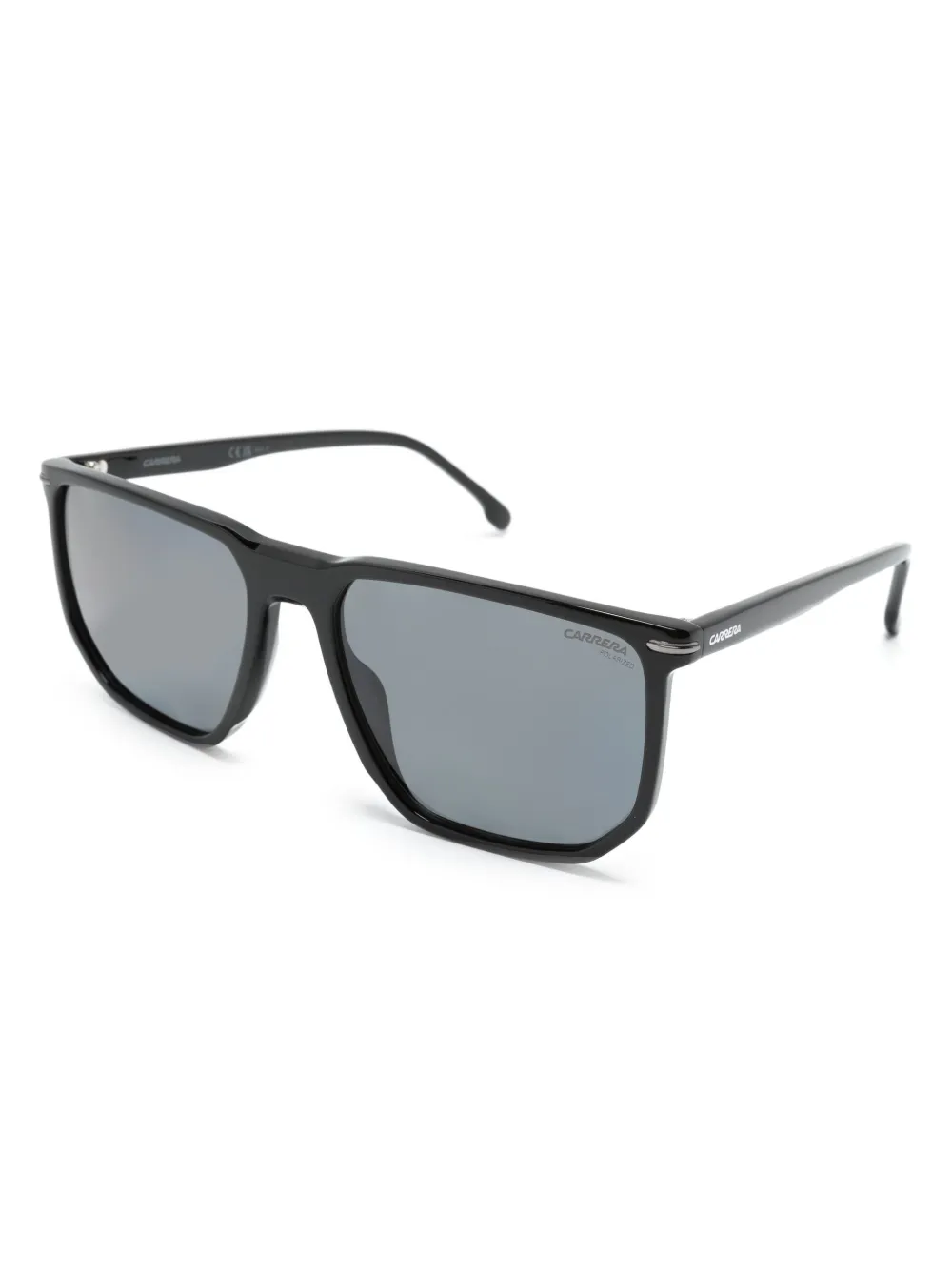 zwart acetaat rechthoekig montuur grijze glazen glazen met UV-beschermingpolariserende glazen zilverkleurig logo rechte pootjes gebogen uiteinden Deze bril wordt verkocht met een beschermhoes.