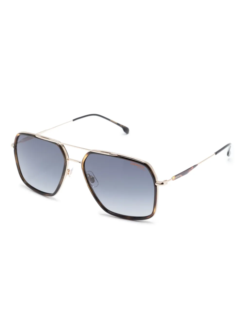 bruin/goudkleurig piloten montuur vak met schildpadschild-effect glazen met kleurverloop lens sticker neuskussentjes metalen staaf bij de wenkbrauwen rechte pootjes pootje met gegraveerd logo gebogen uiteinde Deze bril wordt verkocht met een beschermhoes.