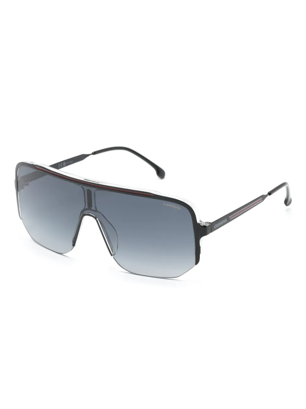Zwart/rood, acetaat, metaal, shield montuur, contrasterende vlakken, gekleurde glazen, lens sticker, pootje met gegraveerd logo, rechte pootjes en gebogen uiteinde. Deze bril wordt verkocht met een beschermhoes..