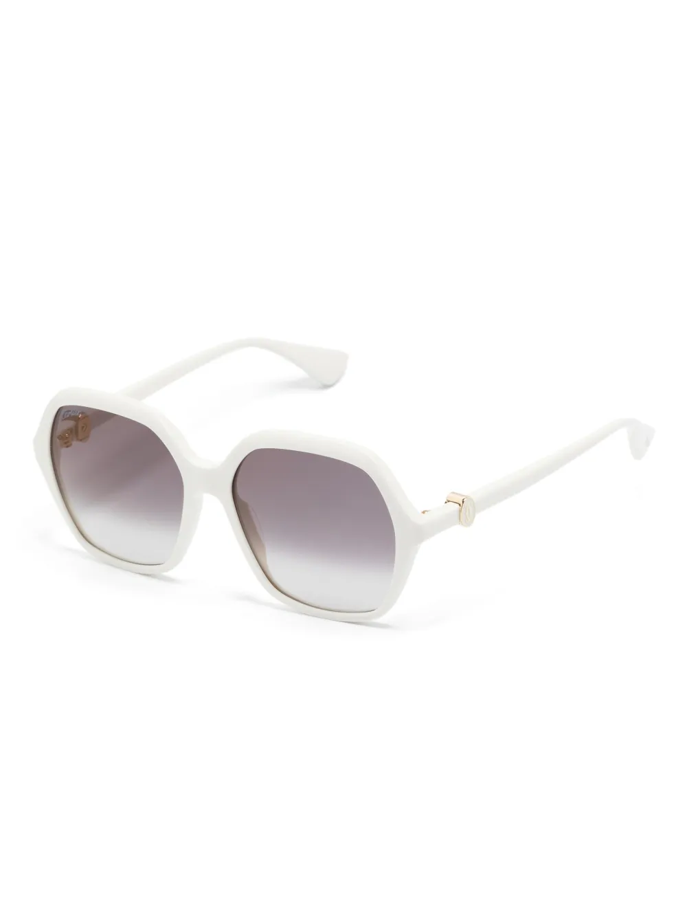 wit acetaat geometrisch montuur glazen met kleurverloop lens sticker glazen met UV-bescherming goudkleurig logo rechte pootjes gebogen uiteinden Deze bril wordt verkocht met een beschermhoes.