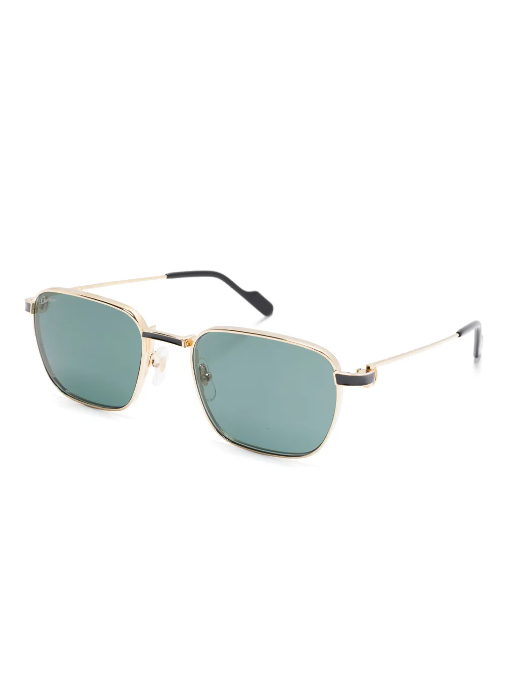goudkleurig/zwart metaal gegraveerd logo op uiteinden lens sticker vierkant montuur groen getinte glazen glazen met UV-bescherming neuskussentjes rechte pootjes gebogen uiteinden Deze bril wordt verkocht met een beschermhoes.