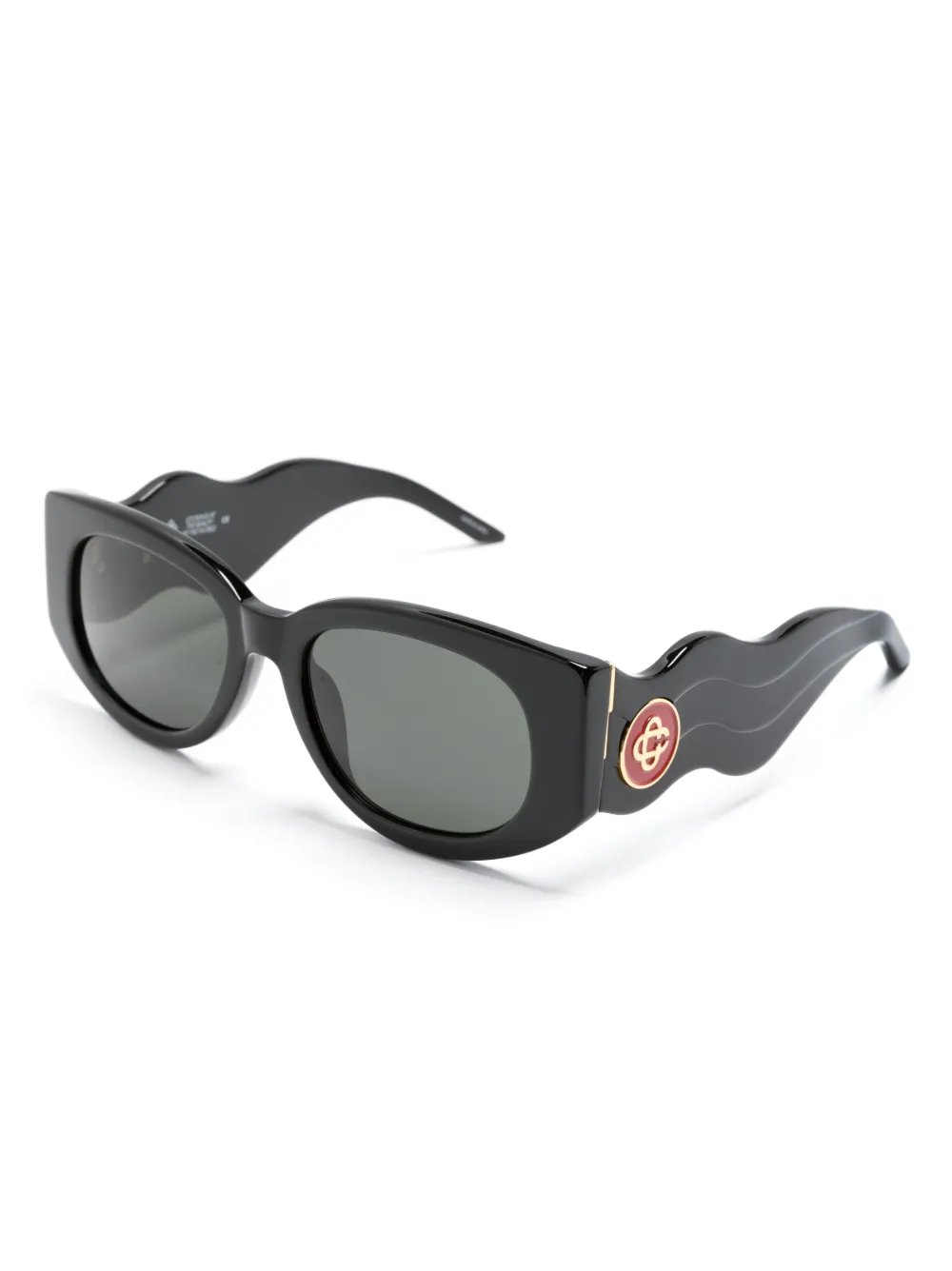 Zwart, rechthoekig montuur, gekleurde glazen, logoplakkaat op het pootje, geschulpte pootjes en UV-bescherming. Deze bril wordt verkocht met een beschermhoes..