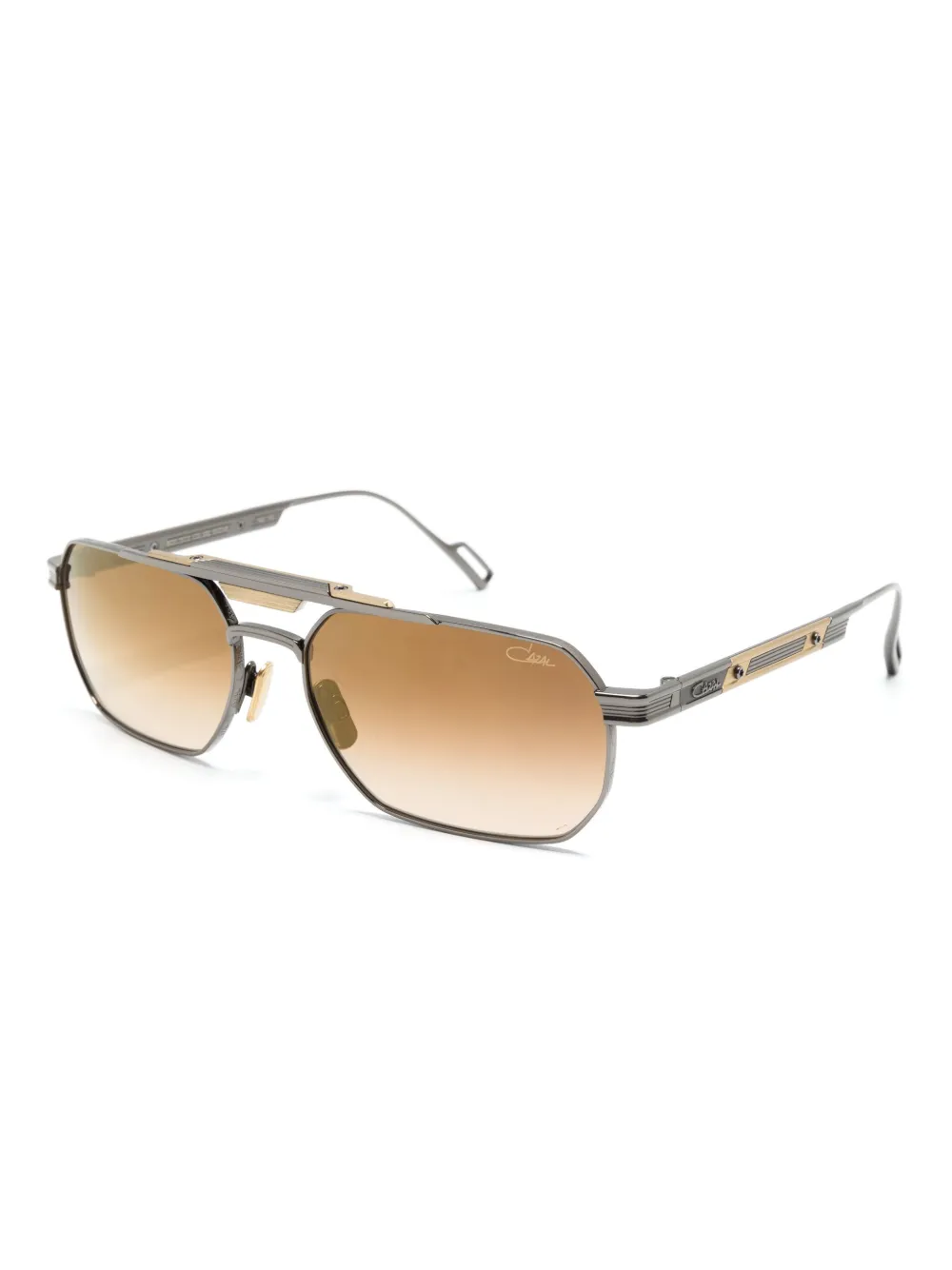 gunmetal grijs titanium rechthoekig piloten montuur bruine glazen met kleurverloop logo lens sticker verhoogde dubbele neusbrug neuskussentjes pootje met gegraveerd logo rechte poten met gebogen uiteinden Deze bril wordt verkocht met een beschermhoes.