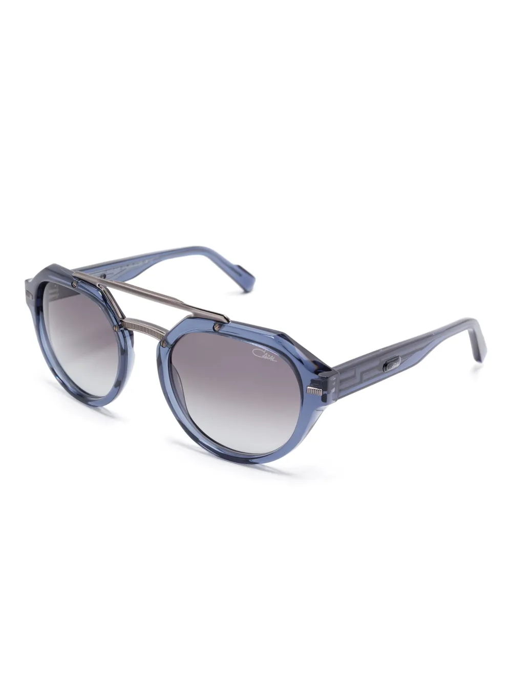 blauw acetaat/metaal rond montuur glazen met kleurverloop dubbele neusbrug logoplakkaat op het pootje rechte pootjes gebogen uiteinden Deze bril wordt verkocht met een beschermhoes.