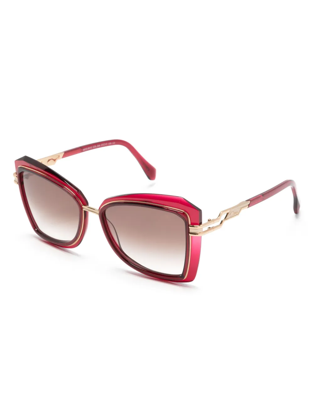 rood acetaat doorzichtig design logoplakkaat op het pootje glazen met kleurverloop oversized montuur rechte pootjes gebogen uiteinden goudkleurig materiaal Deze bril wordt verkocht met een beschermhoes.