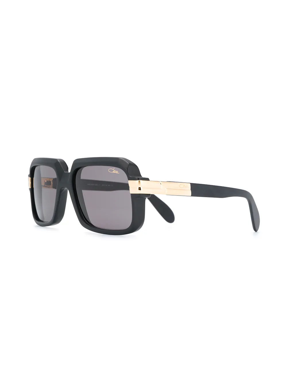 MOD6073 011 zonnebril van Cazal voorzien van vierkant montuur, logo-afbeelding op lens, gekleurde glazen, goudkleurige materiaal, logo-patch op de mouw en gestrekte armen met hoekig uiteinde. Het artikel is inclusief beschermende hoes.