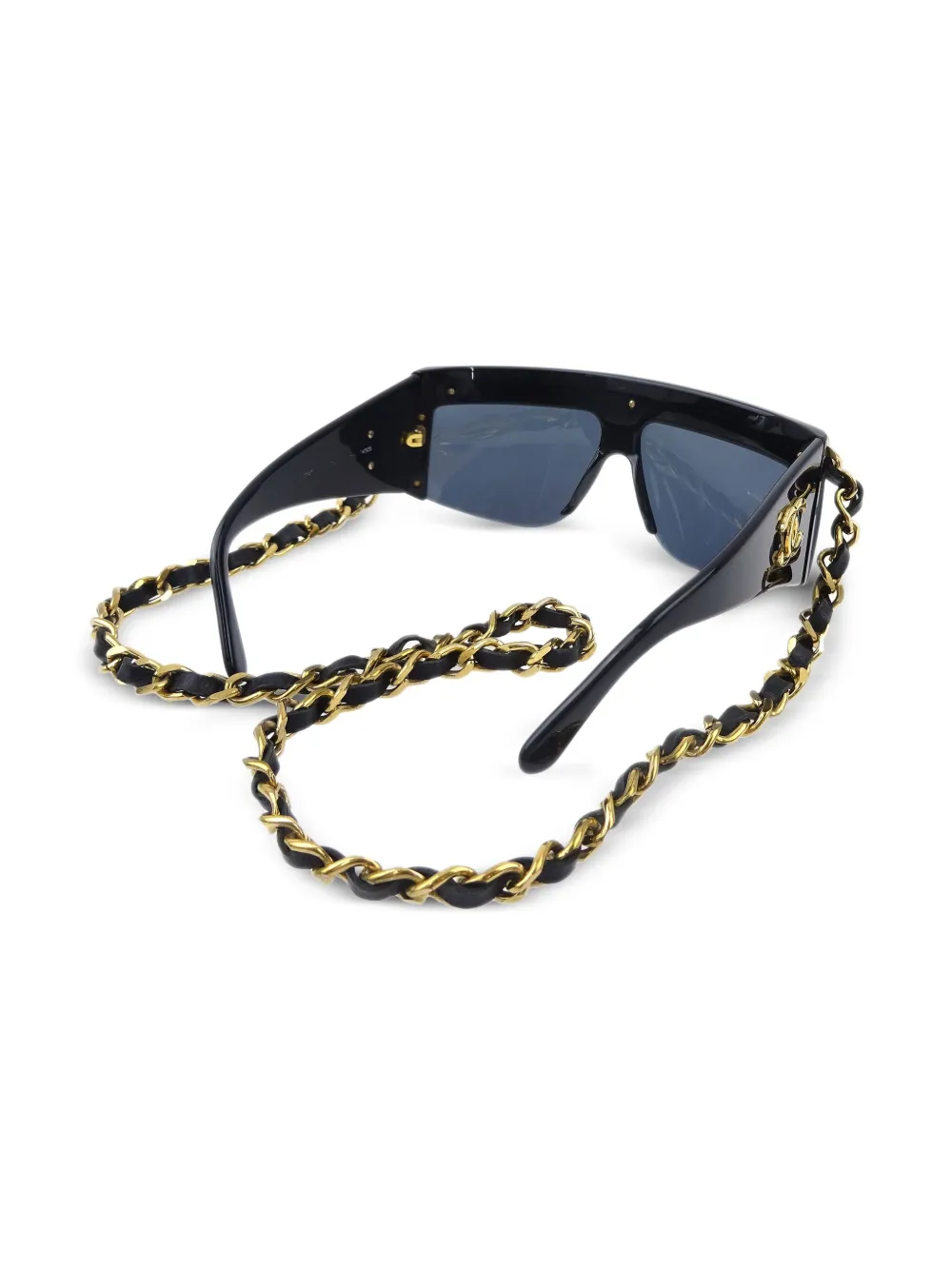 circa 1990-2000s zwart shield montuur grijze glazen leer en schakelkettingdetails kenmerkend CC-logo rechte pootjes gebogen uiteinden goudkleurige hardware Staat: GOED. Dit item is eerder in iemands bezit geweest en gebruikt, maar verkeert in goede staat met minimale gebruikssporen. Dit kan vervaging van materiaal of beplating en krassen omvatten.