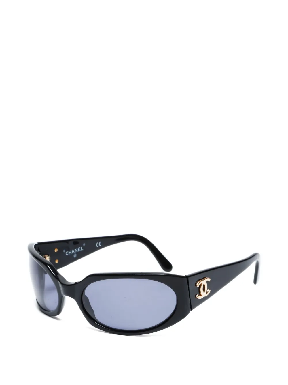 circa 2000 zwart ovalen montuur goudkleurig logodetail grijze glazen Staat: GOED. Dit item is eerder in iemands bezit geweest en gebruikt, maar verkeert in goede staat met minimale gebruikssporen. Dit kan vervaging van materiaal of plating en krassen omvatten. Deze bril wordt verkocht met een beschermhoes.