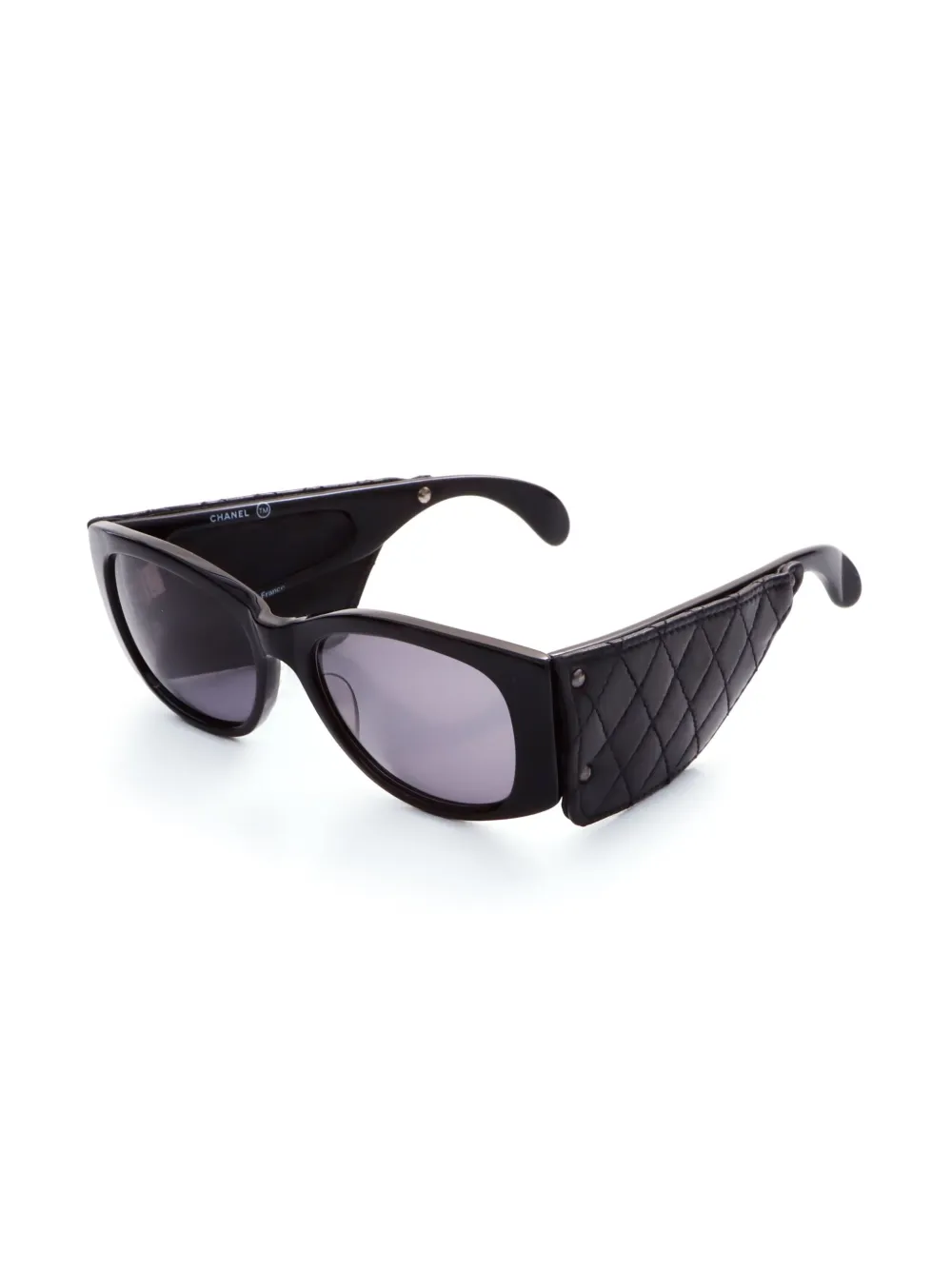 circa 2000 zwart lamsleer grijze glazen UV-bescherming ovaal montuur gewatteerd oversized pootjes gebogen uiteinden Staat: GOED. Dit item is eerder in iemands bezit geweest en gebruikt, maar verkeert in goede staat met minimale gebruikssporen. Dit kan vervaging van materiaal of beplating en krassen omvatten.