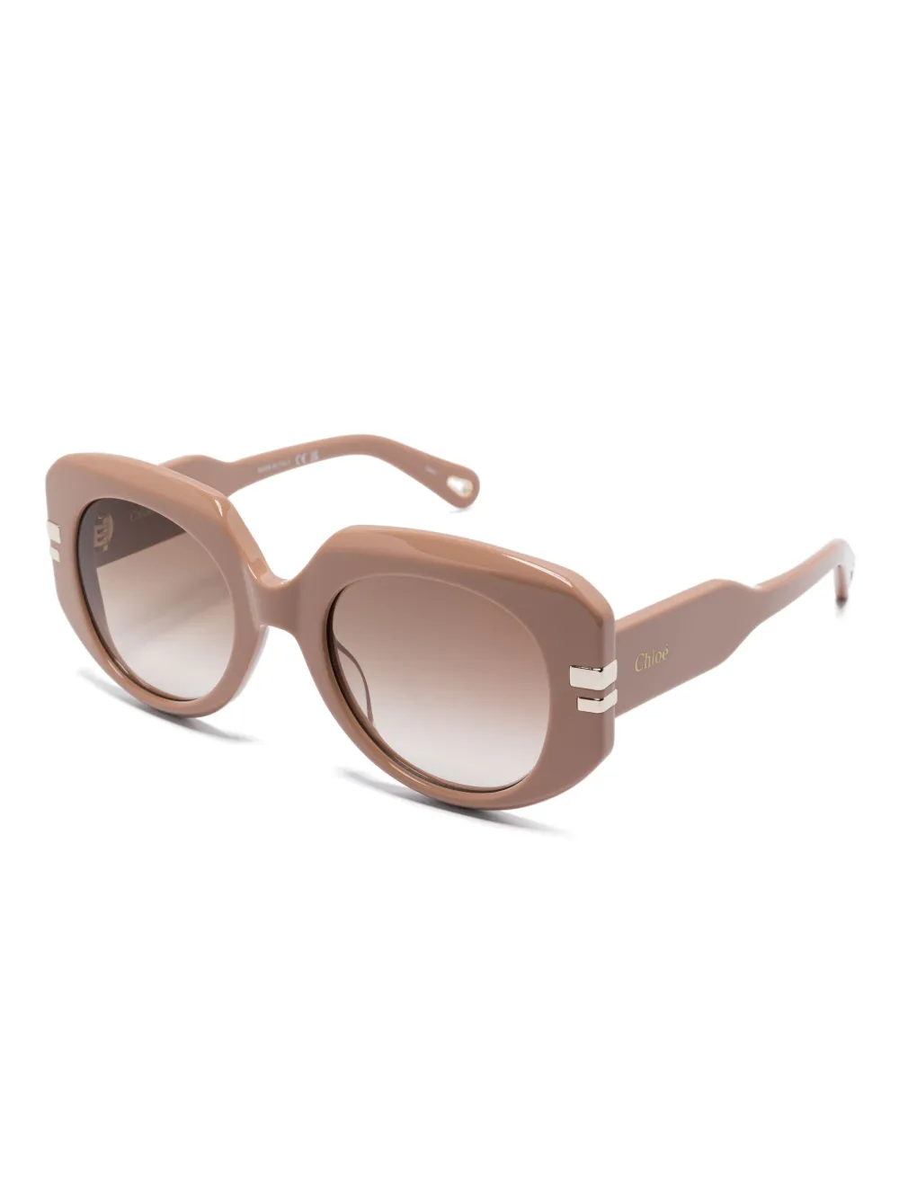 taupe glanzende finish rond montuur glazen met kleurverloop glazen met UV-bescherming pootje met gegraveerd logo rechte pootjes gebogen uiteinden