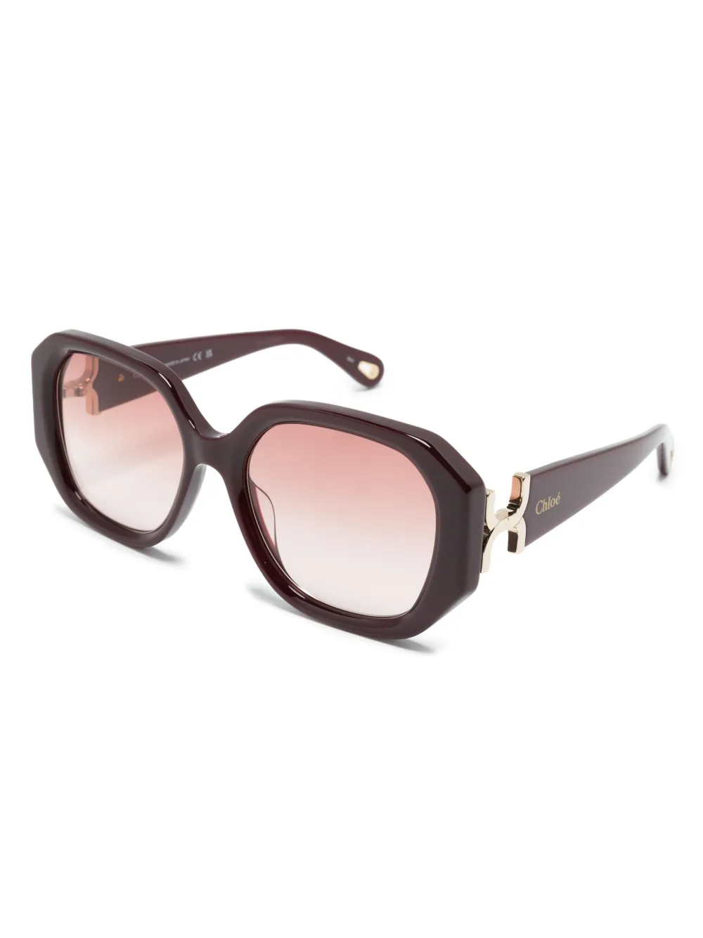 bordeauxrood acetaat vierkant montuur bruin kleurverloop glazen met UV-bescherming pootje met gegraveerd logo uitgesneden detail geschulpte pootjes gebogen uiteinden Deze bril wordt verkocht met een beschermhoes.