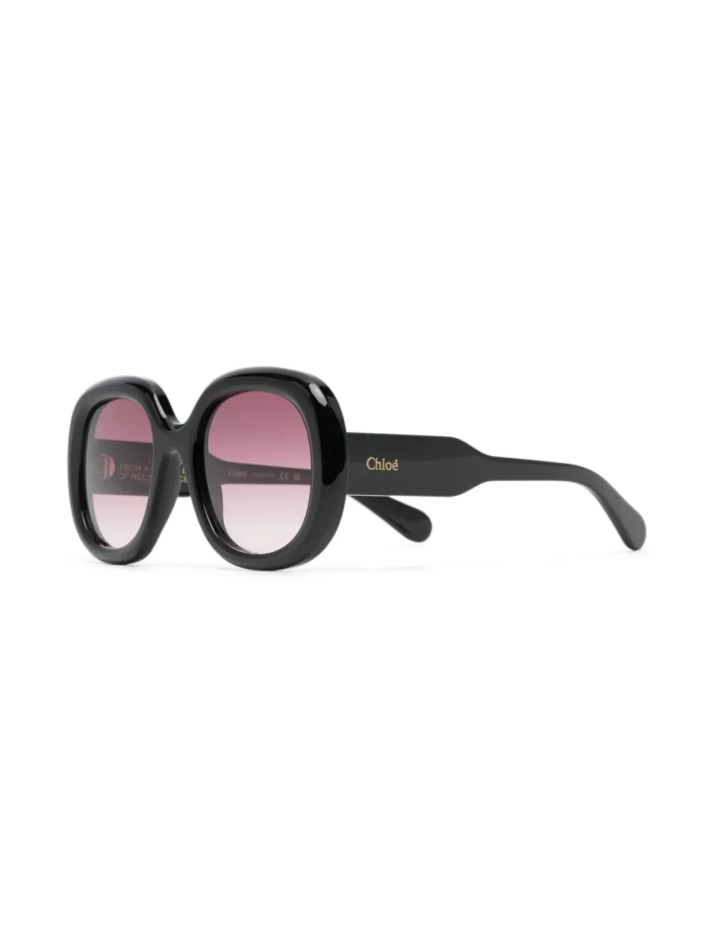Zwart, acetaat, vierkant montuur, rode glazen, glazen met kleurverloop, logoprint op het pootje, rechte pootjes en gebogen uiteinde.