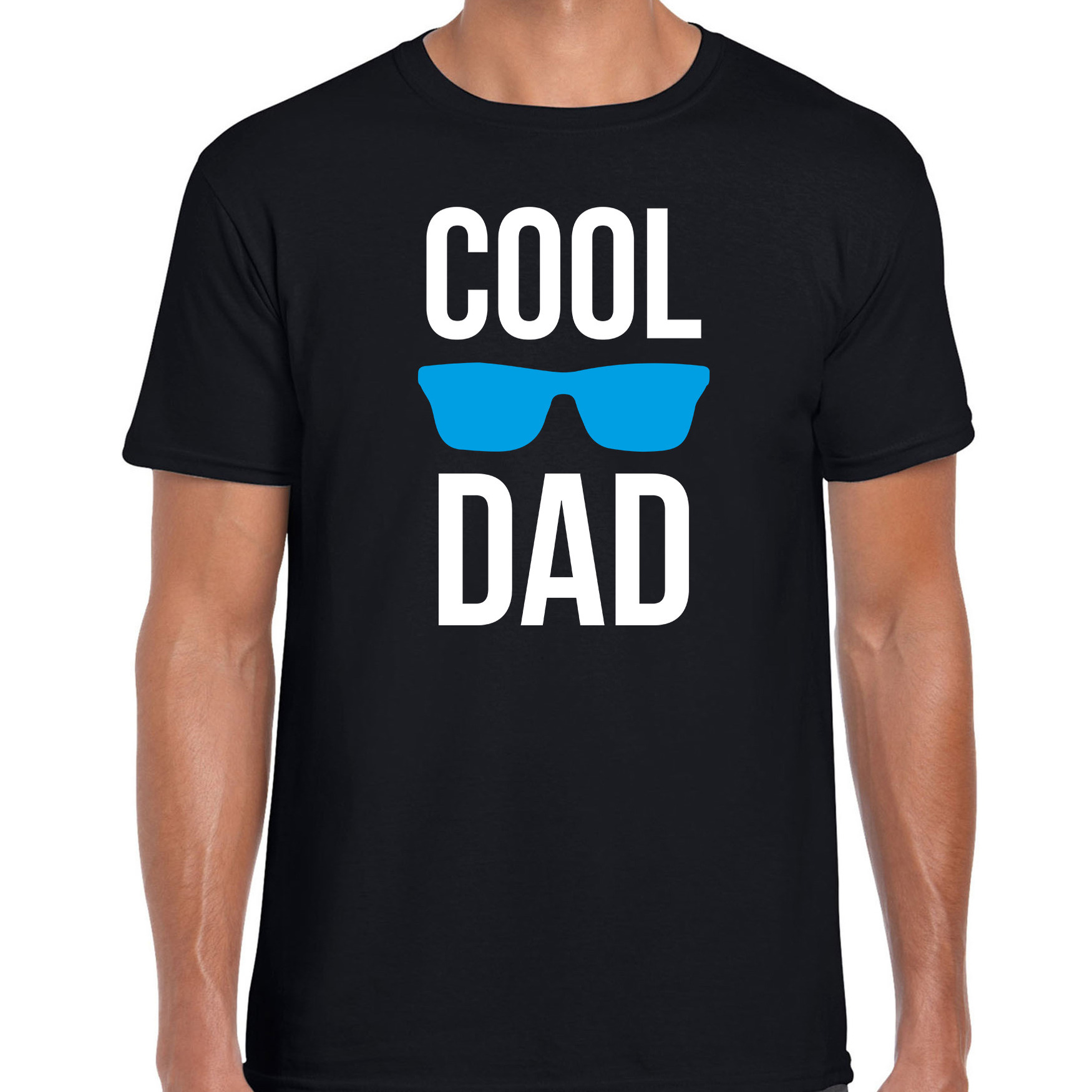 Cadeau shirt papa – cool dad t-shirt zwart voor heren. Op dit zwarte shirt staat in witte letters de tekst: cool dad, met blauwe zonnebril in het midden van de tekst.