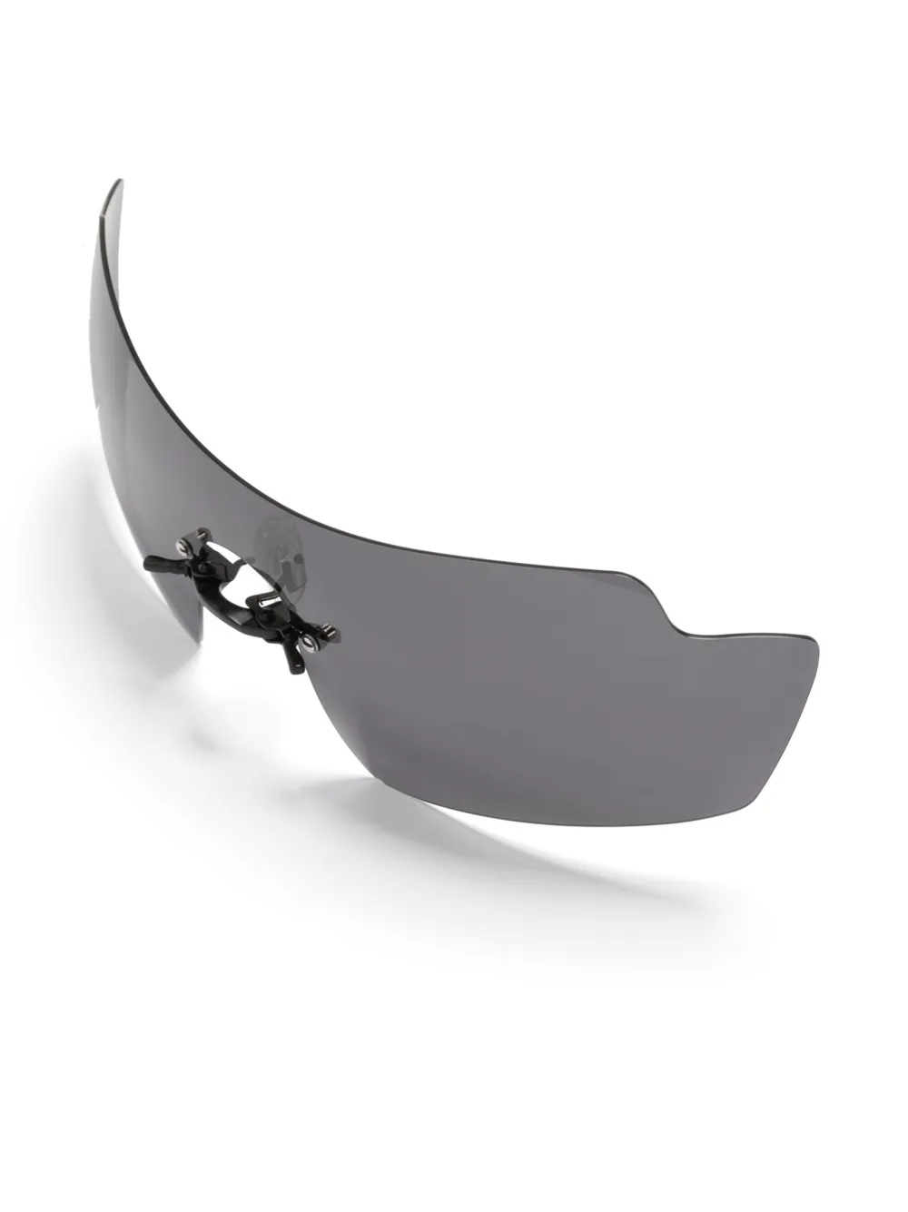 Zwart, gekleurde glazen, oversized montuur, frameloos design en neuskussentjes. Deze bril wordt verkocht met een beschermhoes..