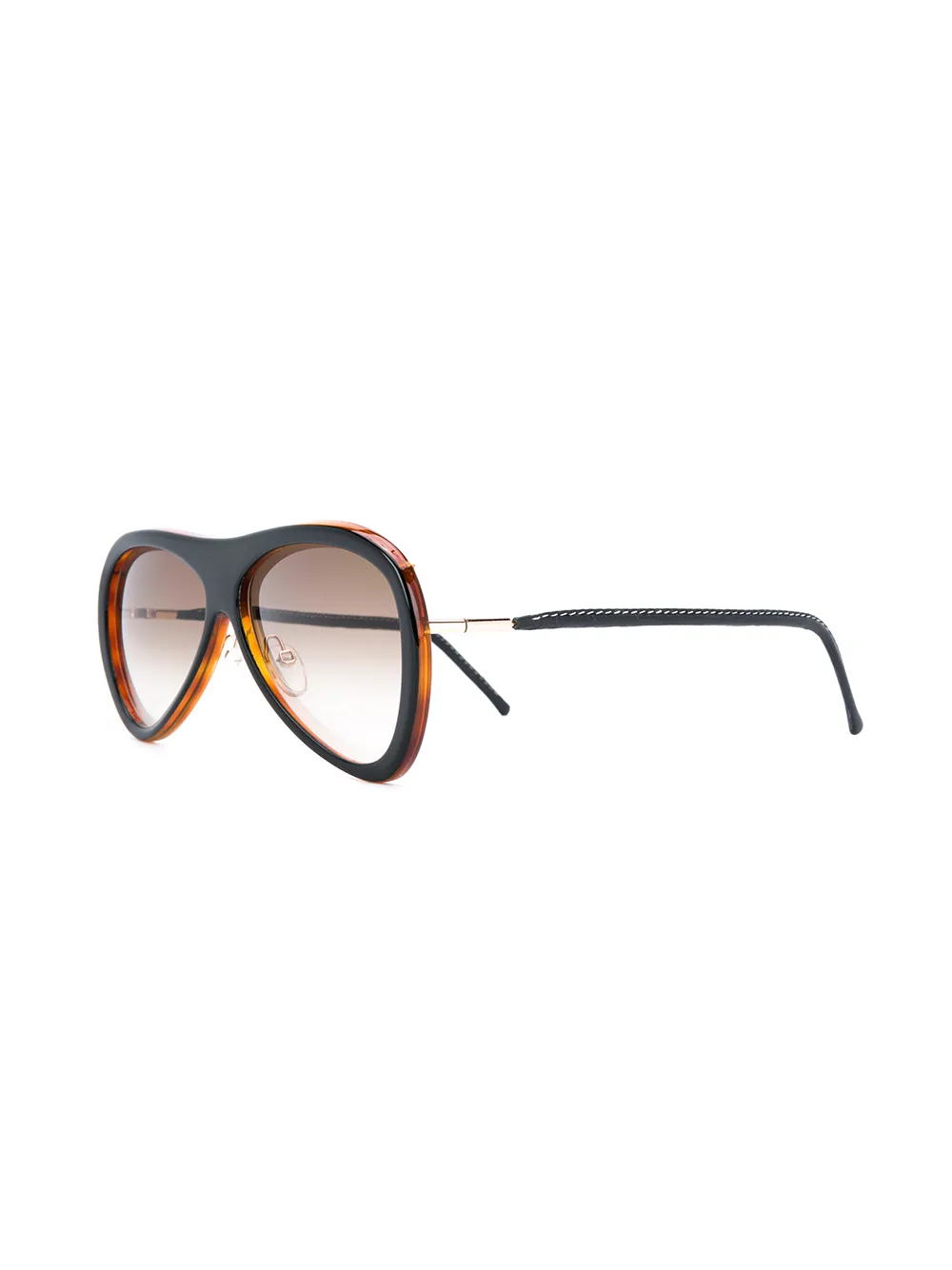Contrasterende stiksels, glazen met kleurverloop, rond montuur en neuskussentjes.