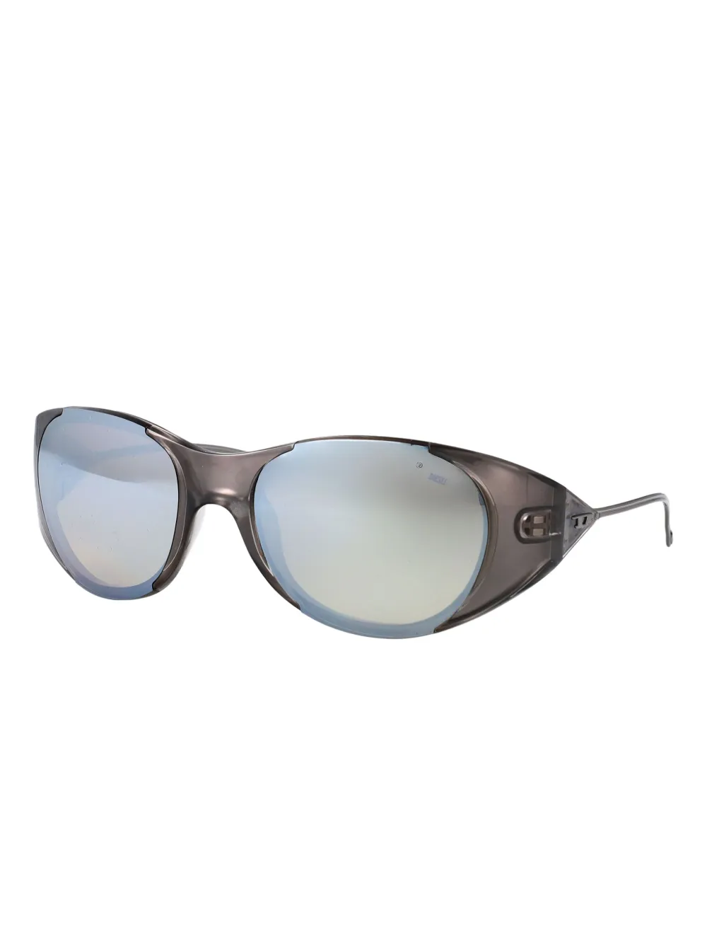 grijs gespiegelde glazen shield montuur smalle pootjes gebogen vorm Deze bril wordt verkocht met een beschermhoes.