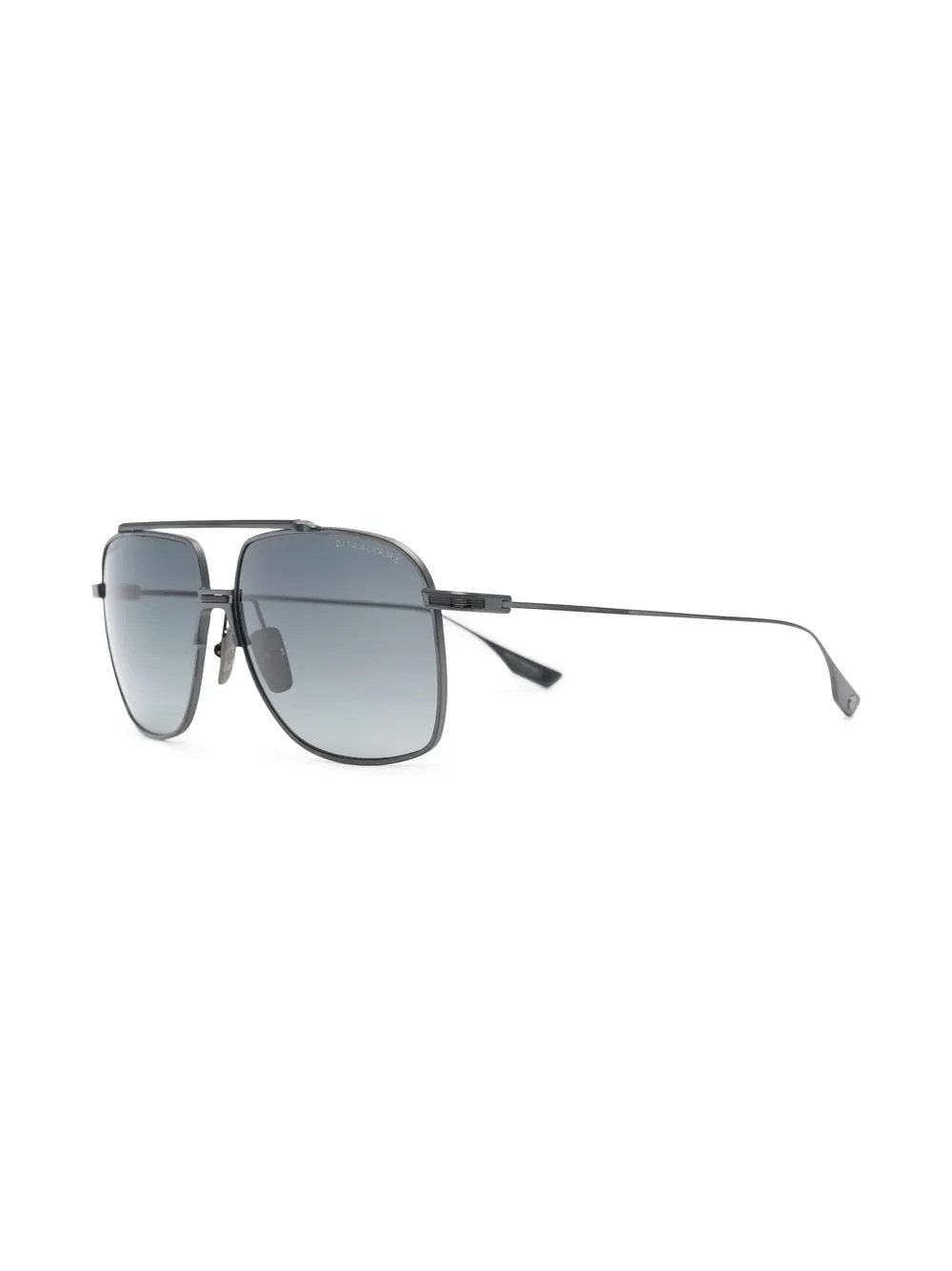 Zilver, titanium, navigator montuur, glazen met kleurverloop, neuskussentjes, UV-bescherming, rechte pootjes en gebogen uiteinde. Deze bril wordt verkocht met een beschermhoes..