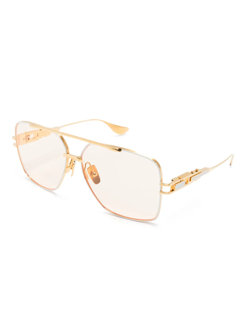 Goudkleurig, titanium, gekleurde glazen, rechthoekig montuur, verhoogde neusbrug, neuskussentjes, rechte pootjes en gebogen uiteinde. Deze bril wordt verkocht met een beschermhoes..