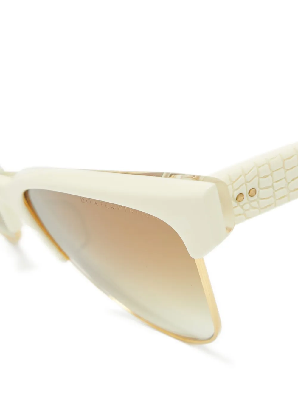 wit cat-eye montuur krokodillen-reliëf op de pootjes bruine glazen met kleurverloop Deze bril wordt verkocht met een beschermhoes. Staat: GOED. Dit item is eerder in iemands bezit geweest en gebruikt, maar verkeert in goede staat met minimale gebruikssporen. Dit kan vervaging van materiaal of plating en krassen omvatten.