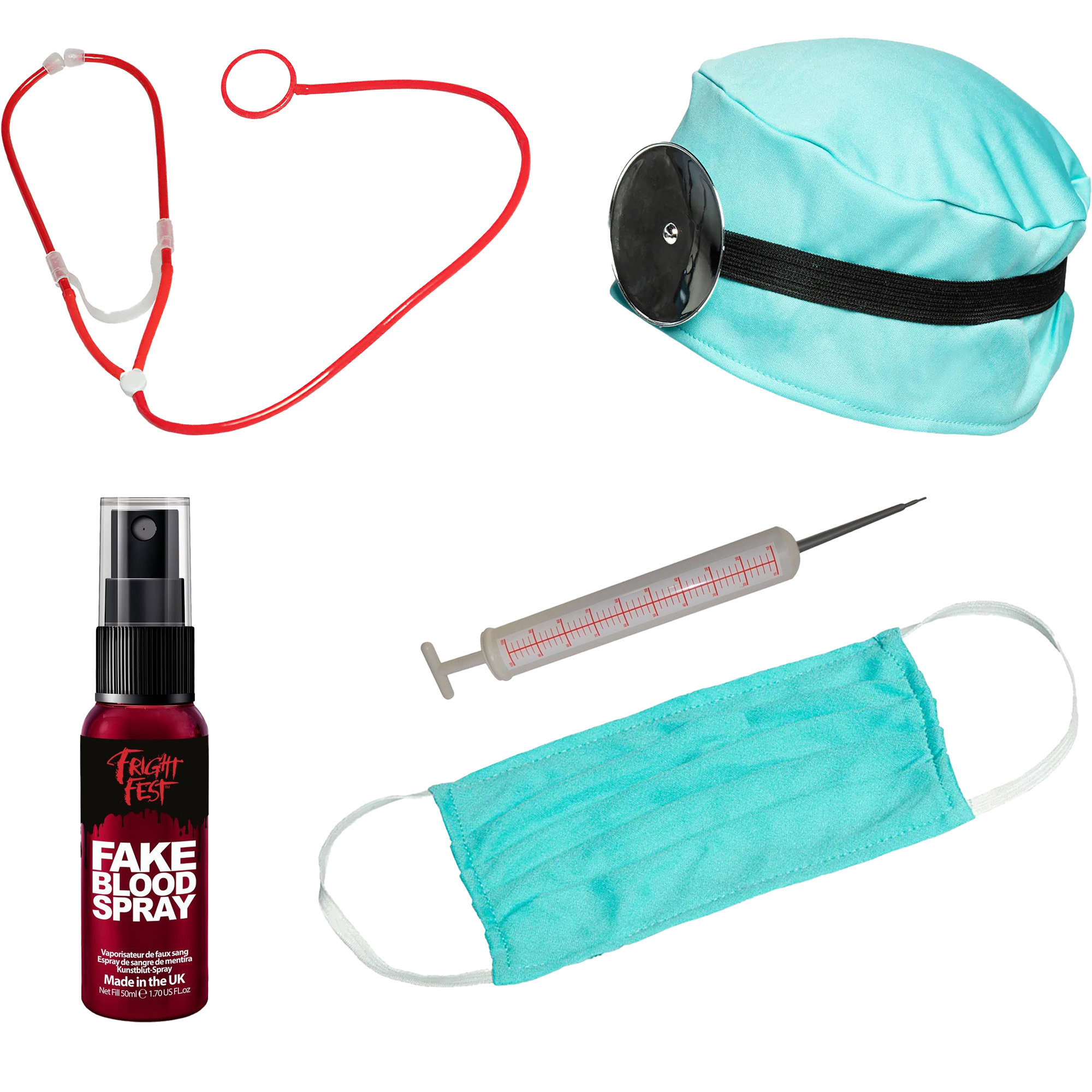 Dokter of chirurg ziekenhuis verkleed set accessoires. Een 6-delige set bestaande uit een stethoscoop, een grote spuit van 80 cm, sprayflesje met 50 ml nepbloed, mondkapje, hoofdkapje en reflector. Zo ben je snel helemaal in je rol. De set is geschikt voor volwassenen. Carnaval ziekenhuis thema verkleedkleding accessoires voor dames en heren. Wat je nog kan toevoegen: lange witte jas of kostuum, nepwonden, pleisters, thermometer. , Dit artikel bestaat uit:, 1x Carnaval verkleed injectie spuit – groot – 82 cm – kunststof – zuster/verpleegster, 1x Paint Glow Nep bloed schmink/make up – spray – 50 ml, 1x Carnaval verkleed set Dokter/Chirurg – hoofdstuk/stethoscoop/mondkapje – groen – volwassenen