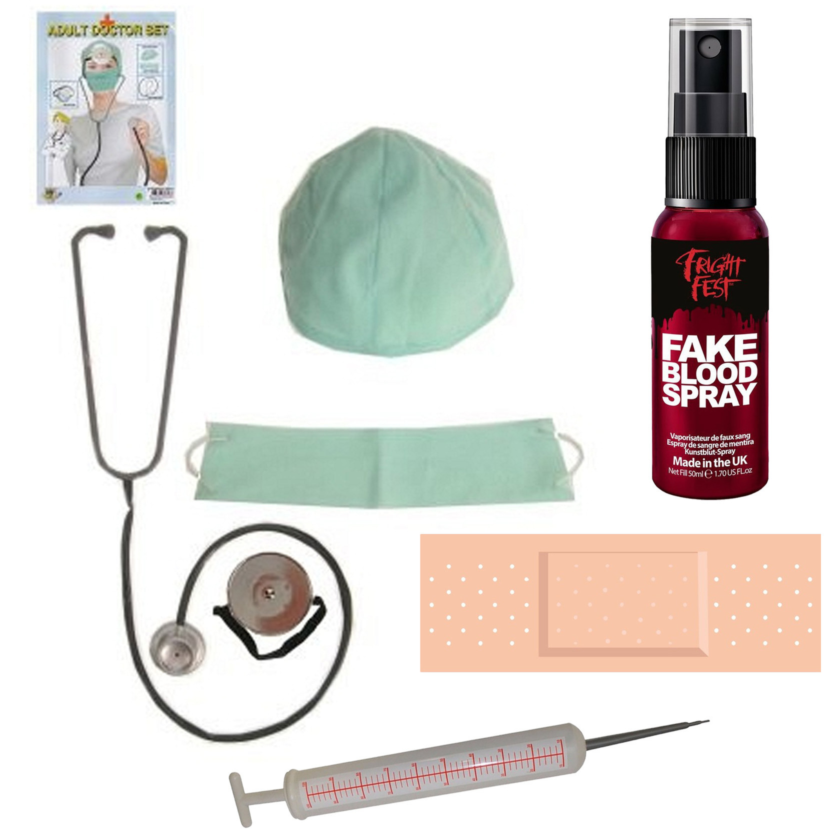 Dokter of chirurg ziekenhuis verkleed set accessoires. Een 8-delige set bestaande uit een stethoscoop, een grote spuit van 80 cm, 2x mega pleisters 6 x 19 cm, sprayflesje met 50 ml nepbloed, mondkapje, hoofdkapje en reflector. Zo ben je snel helemaal in je rol. De set is geschikt voor volwassenen. Carnaval ziekenhuis thema verkleedkleding accessoires voor dames en heren. Wat je nog kan toevoegen: lange witte jas of kostuum, nepwonden, pleisters, thermometer. , Dit artikel bestaat uit:, 1x Dokters / chirurg verkleed accessoires set – 4 delig – ziekenhuis thema – carnaval – volwassenen, 1x Carnaval verkleed injectie spuit – groot – 82 cm – kunststof – zuster/verpleegster, 2x Mega pleister sticker 6 x 19 cm, 1x Paint Glow Nep bloed schmink/make up – spray – 50 ml