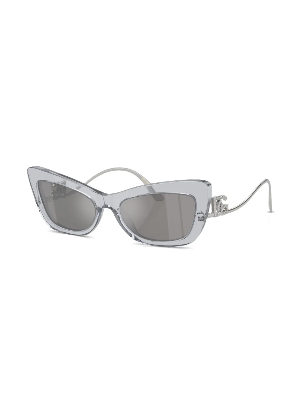 zilverkleurig metaal doorzichtig ontwerp cat-eye montuur gespiegelde glazen glazen met UV-bescherming logoplakkaat op de mouw verfraaid met kristallen geschulpte pootjes gebogen uiteinden Deze bril wordt verkocht met een beschermhoes.
