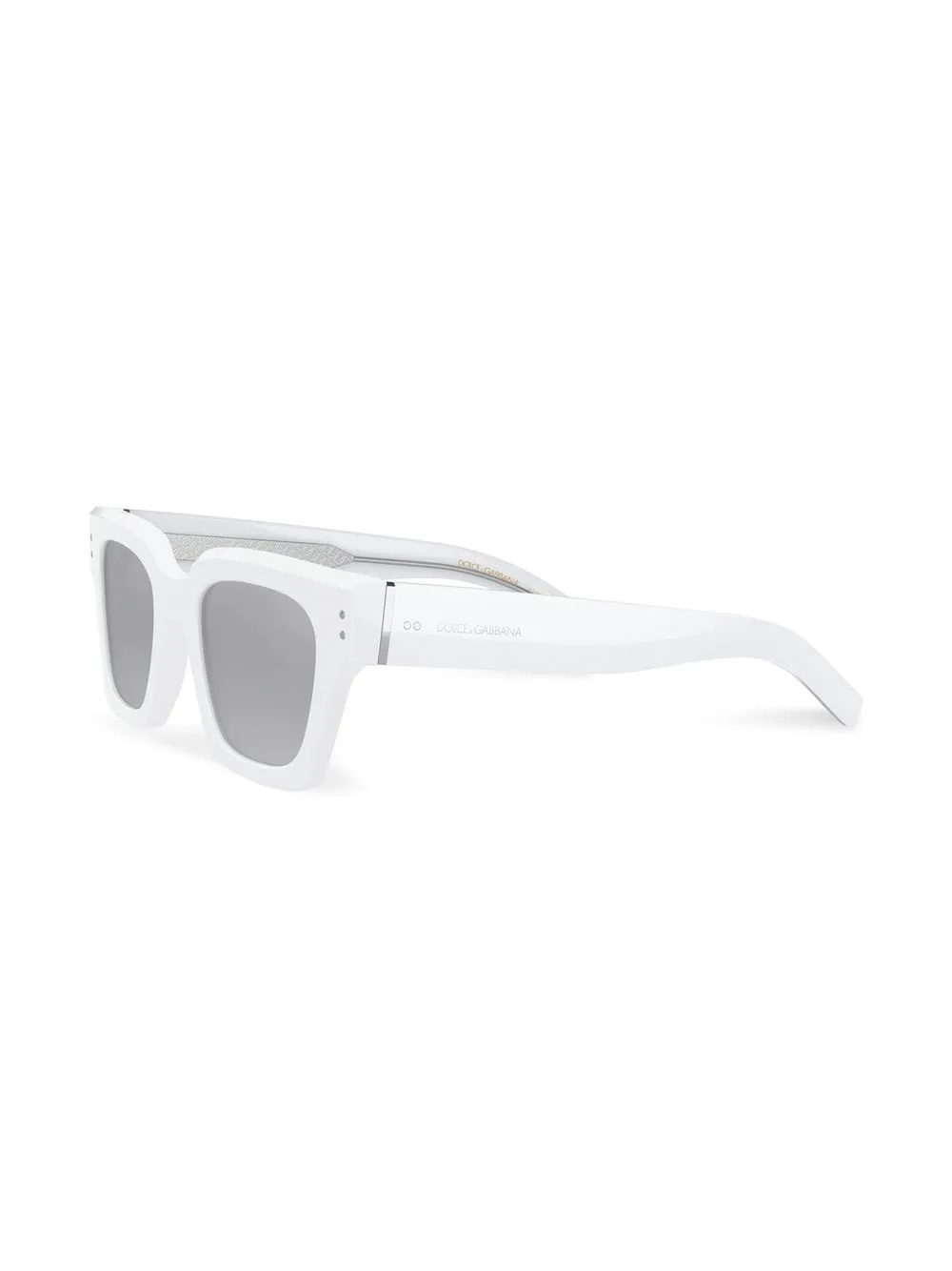 Wit, D-montuur, grijze glazen, glazen met UV-bescherming, logoprint op het pootje, rechte pootjes en gebogen uiteinde. Deze bril wordt verkocht met een beschermhoes..