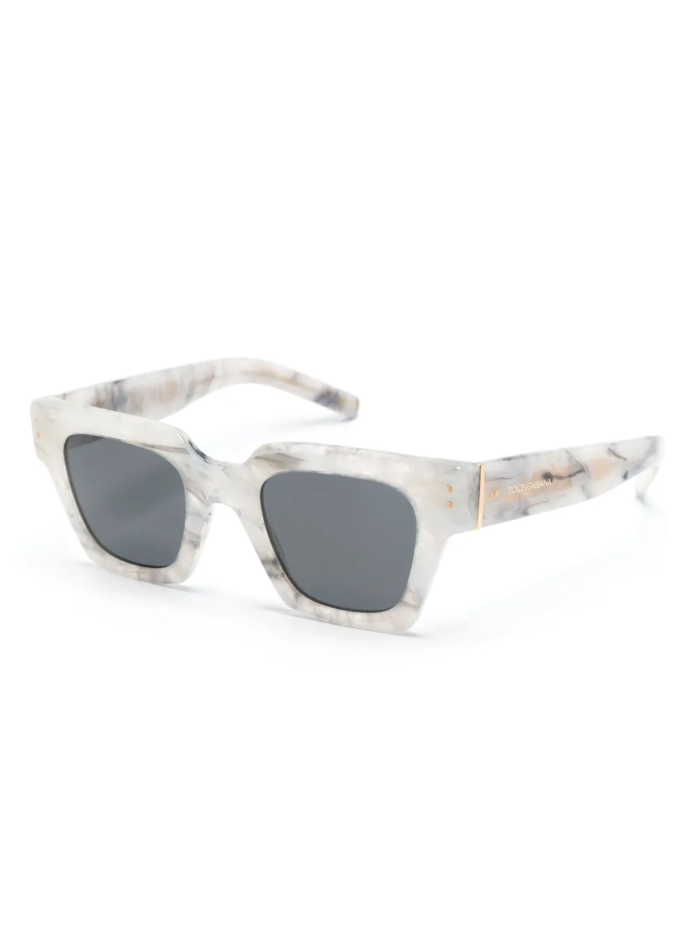 lichtgrijs acetaat marmeren patroon vierkant montuur glazen met UV-bescherming pootje met gegraveerd logo rechte pootjes gebogen uiteinden
