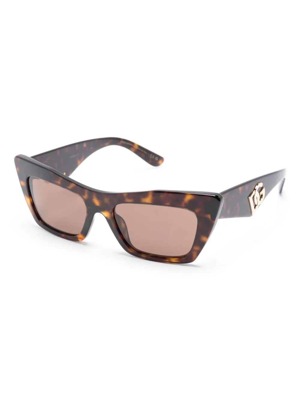 Bruin, acetaat, acrylglas, bruine glazen, schildpad montuur, cat-eye montuur, logoplakkaat op het pootje en gebogen uiteinde. Deze bril wordt verkocht met een beschermhoes..