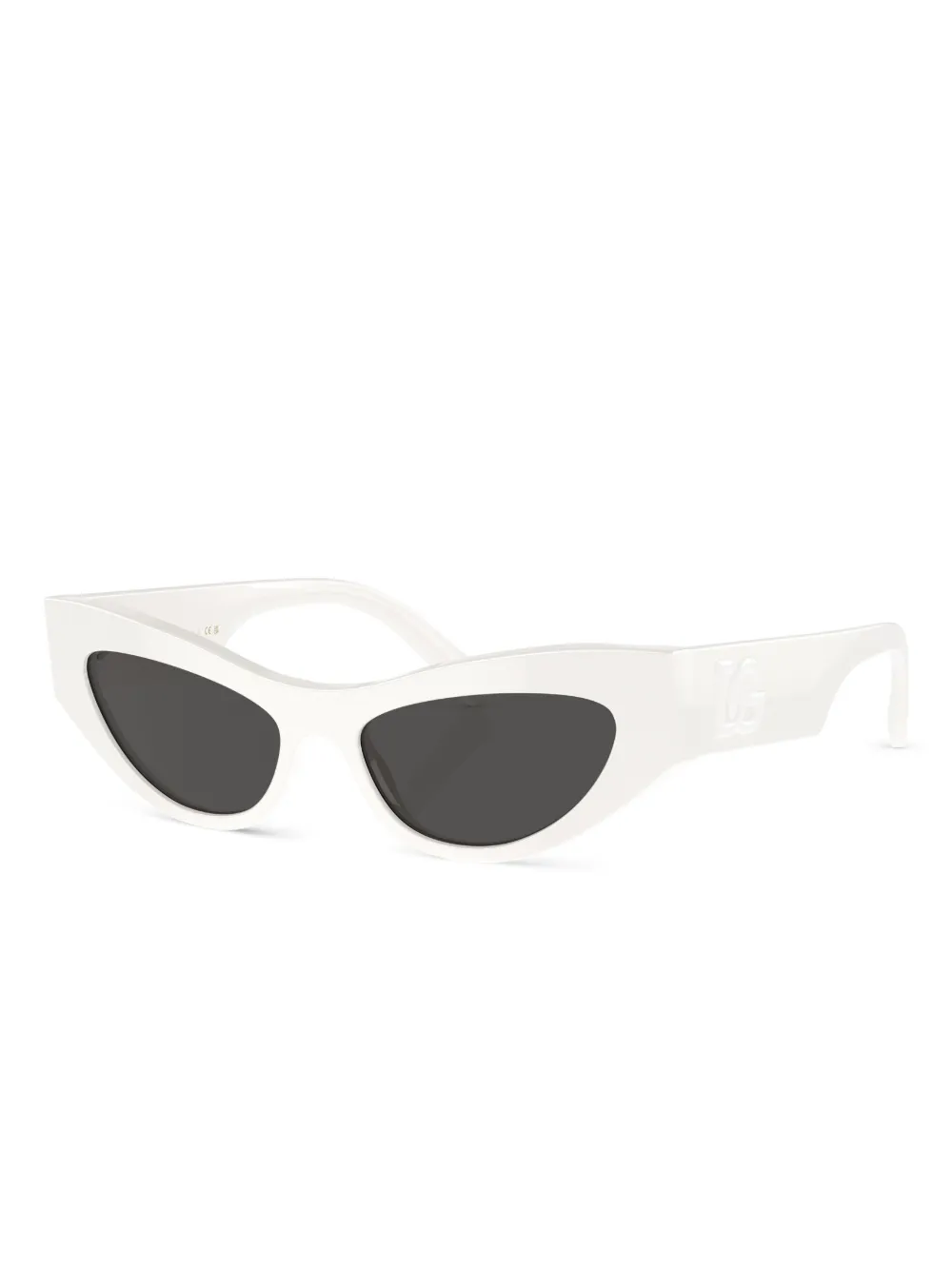 Wit, acetaat, ovaal montuur, grijze glazen, logoplakkaat op het pootje, gewelfde pootjes en gebogen uiteinde. Deze bril wordt verkocht met een beschermhoes..