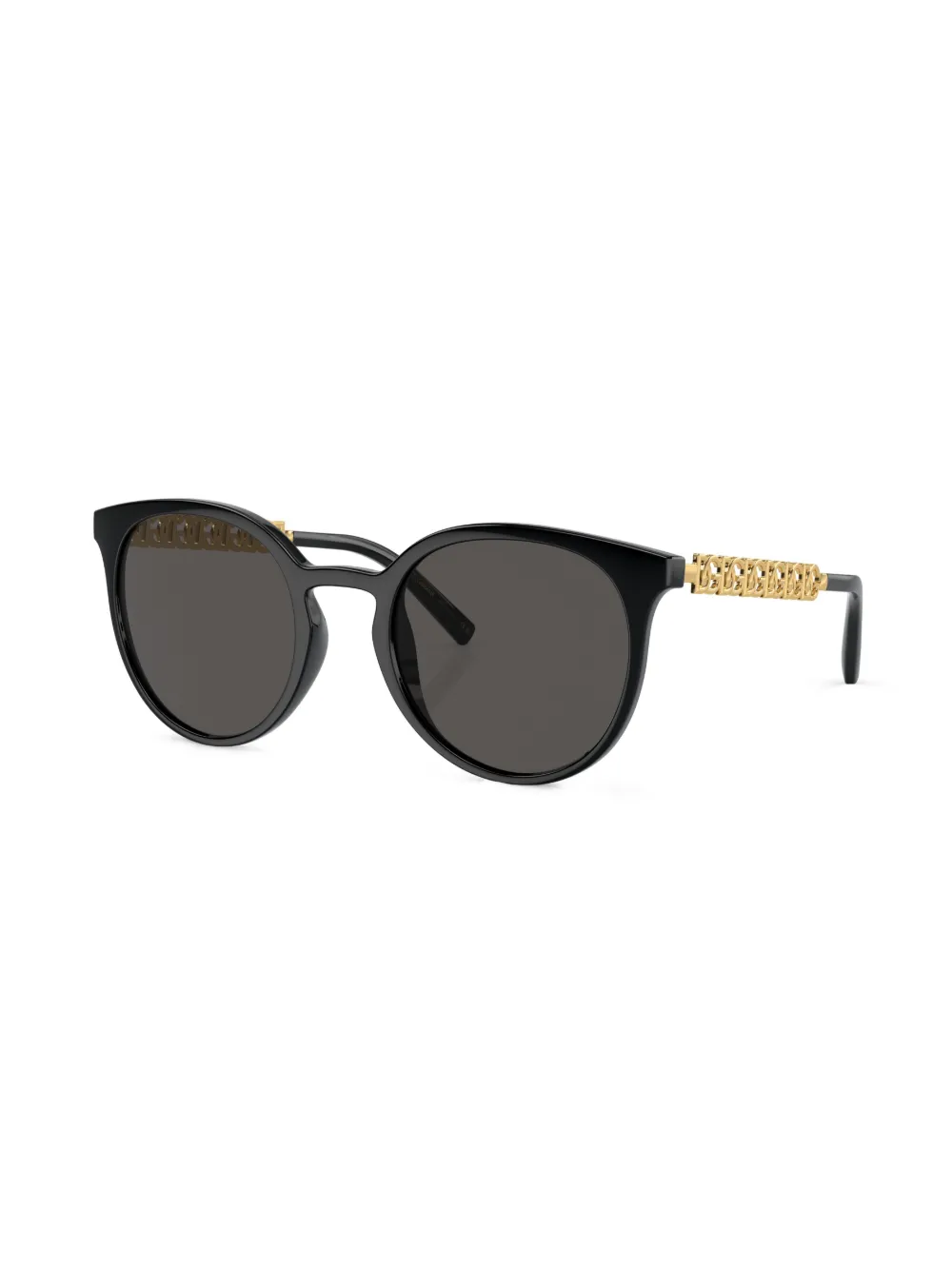 Zwart, acetaat, rond montuur, gekleurde glazen, logoplakkaat op het pootje, rechte pootjes en gebogen uiteinde. Deze bril wordt verkocht met een beschermhoes..