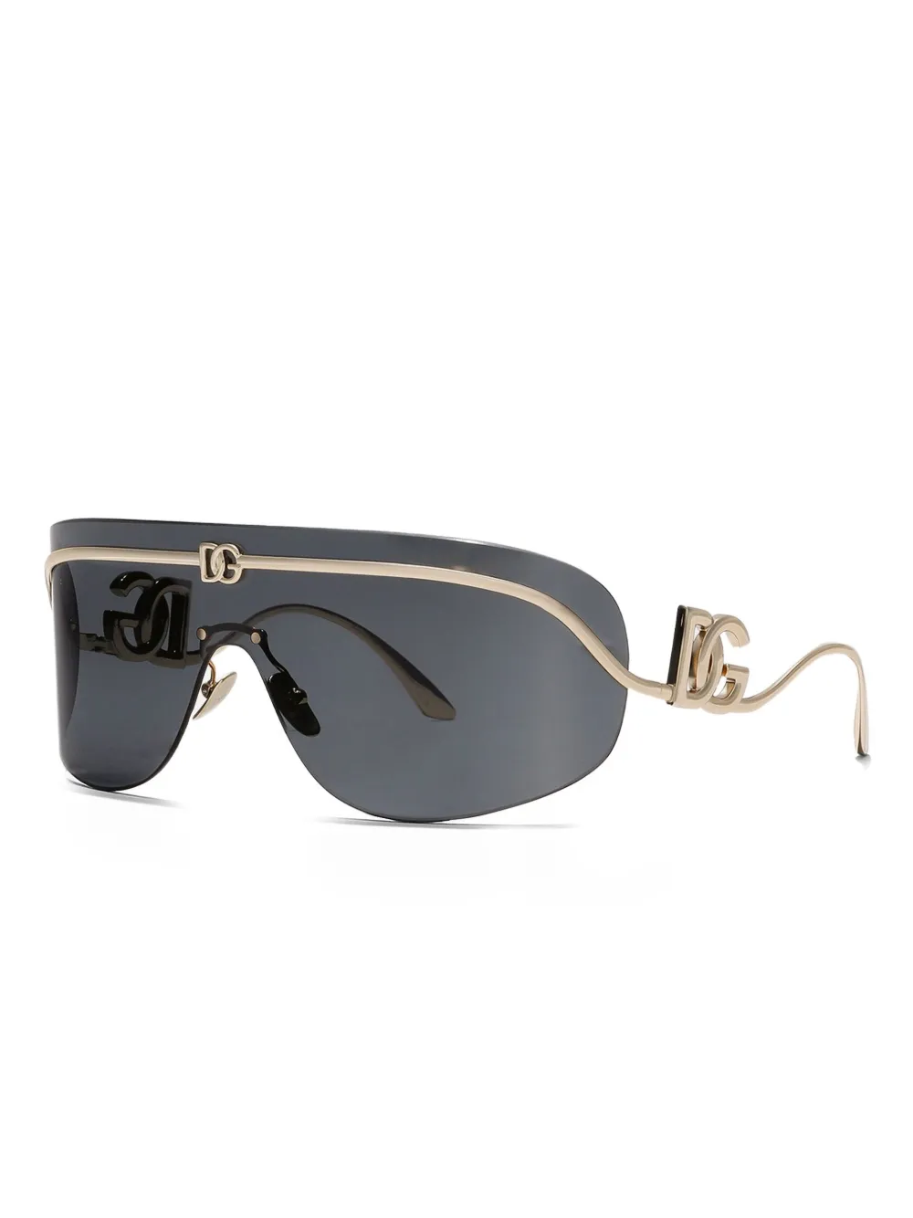 zwart shield montuur goudkleurig logoplakkaat pootjes verfraaid met logo donkergrijze glazen Deze bril wordt verkocht met een beschermhoes.