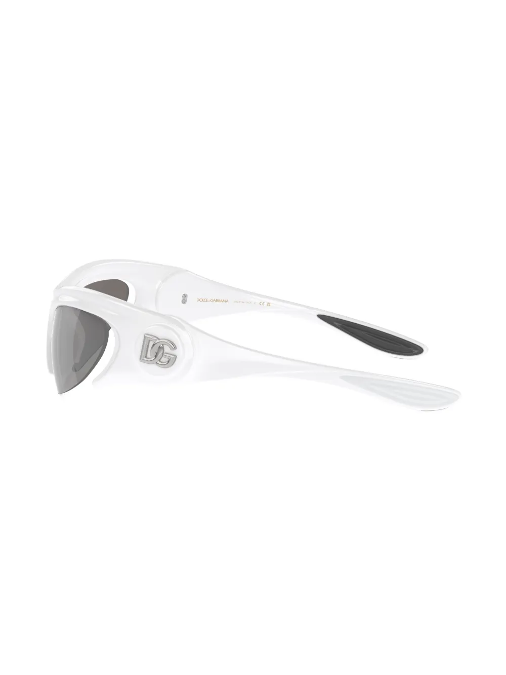 Wit, shield montuur, gekleurde glazen, zilverkleurig logo, rechte pootjes en gebogen uiteinde. Deze bril wordt verkocht met een beschermhoes..