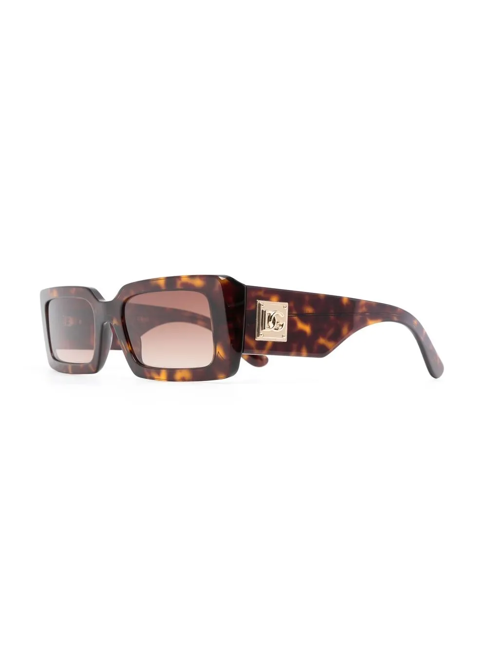Bruin, vierkant montuur, goudkleurig logo, glazen met kleurverloop, rechte pootjes en gebogen uiteinde.
