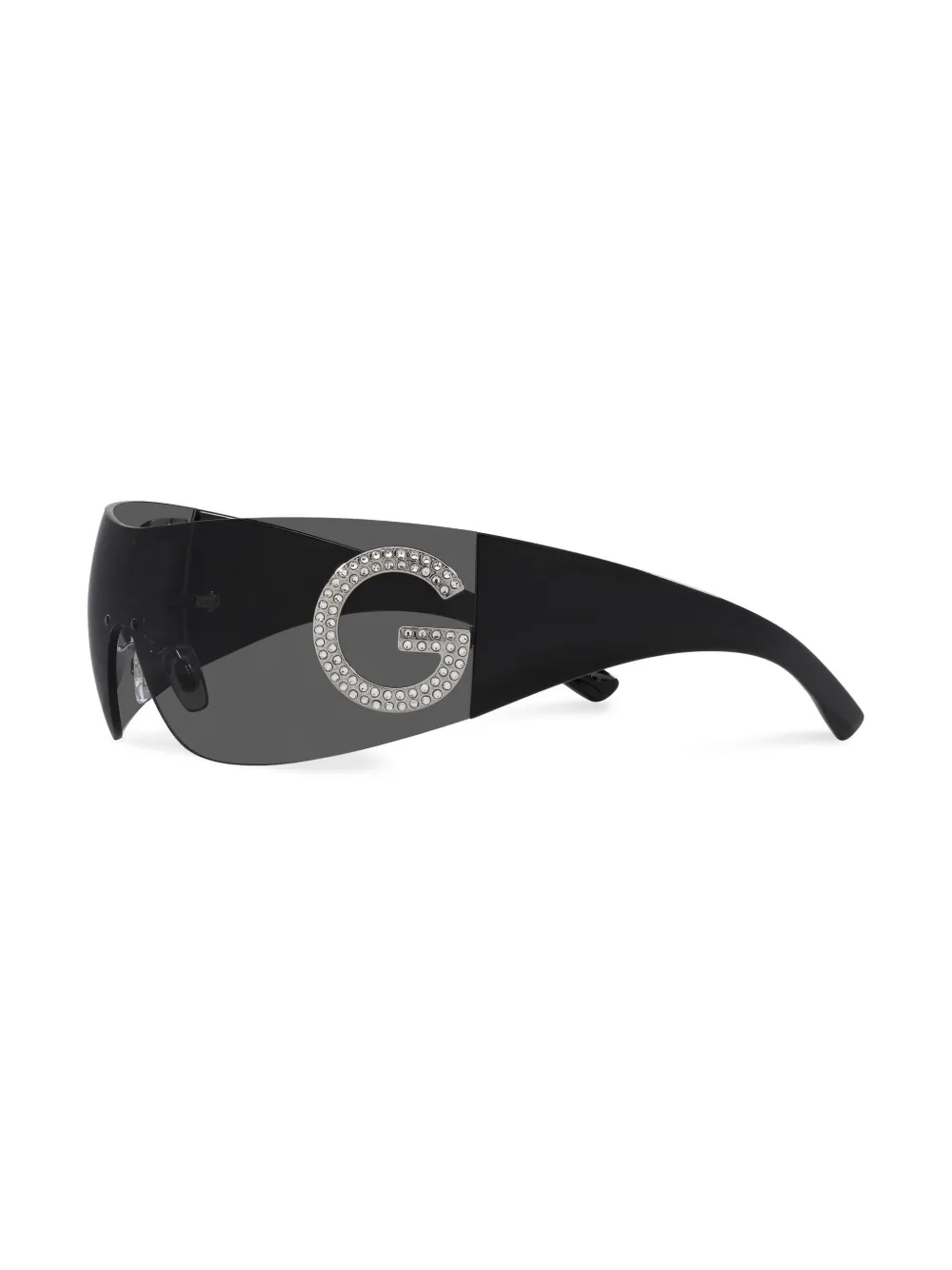 zwart verfraaid met bergkristallen logoplakkaat shield montuur grijze glazen neuskussentjes rechte pootjes gebogen uiteinden Deze bril wordt verkocht met een beschermhoes.