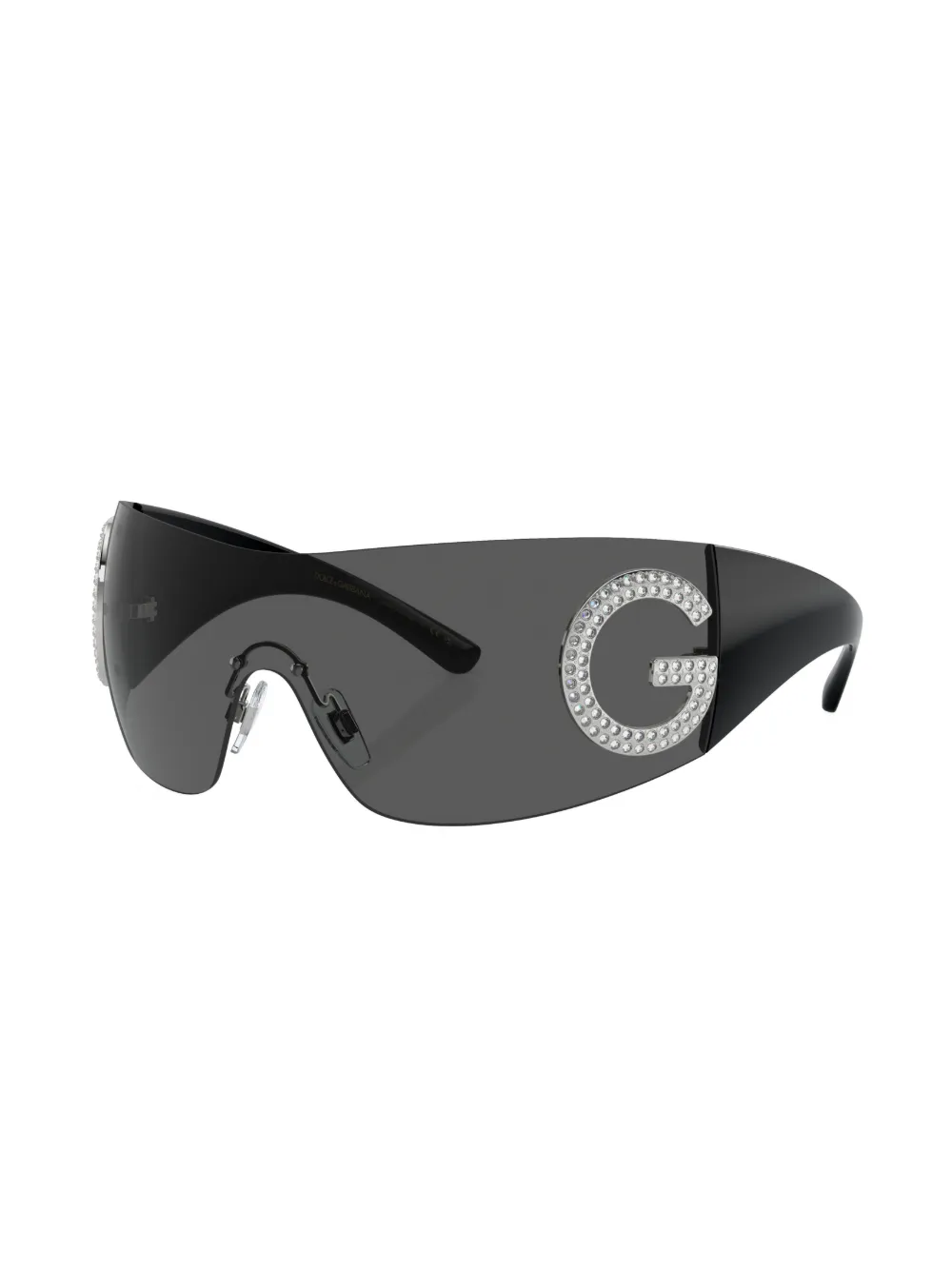 Zwart, acetaat, metaal, shield montuur, gekleurde glazen, verfraaid met kristallen, zilverkleurig logo en gewelfde pootjes. Deze bril wordt verkocht met een beschermhoes..